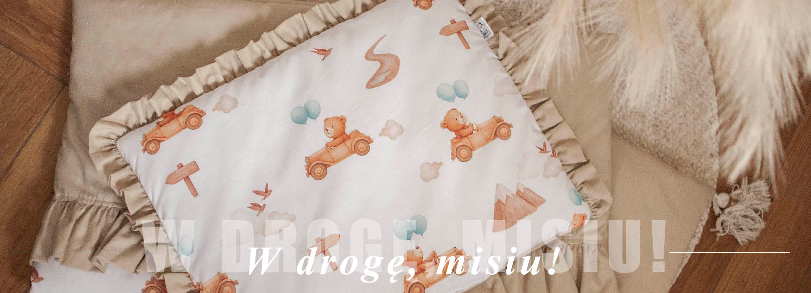 Kołderka z poduszką do łóżeczka z wypełnieniem z falbankami W DROGĘ, MISIU! + BEŻ