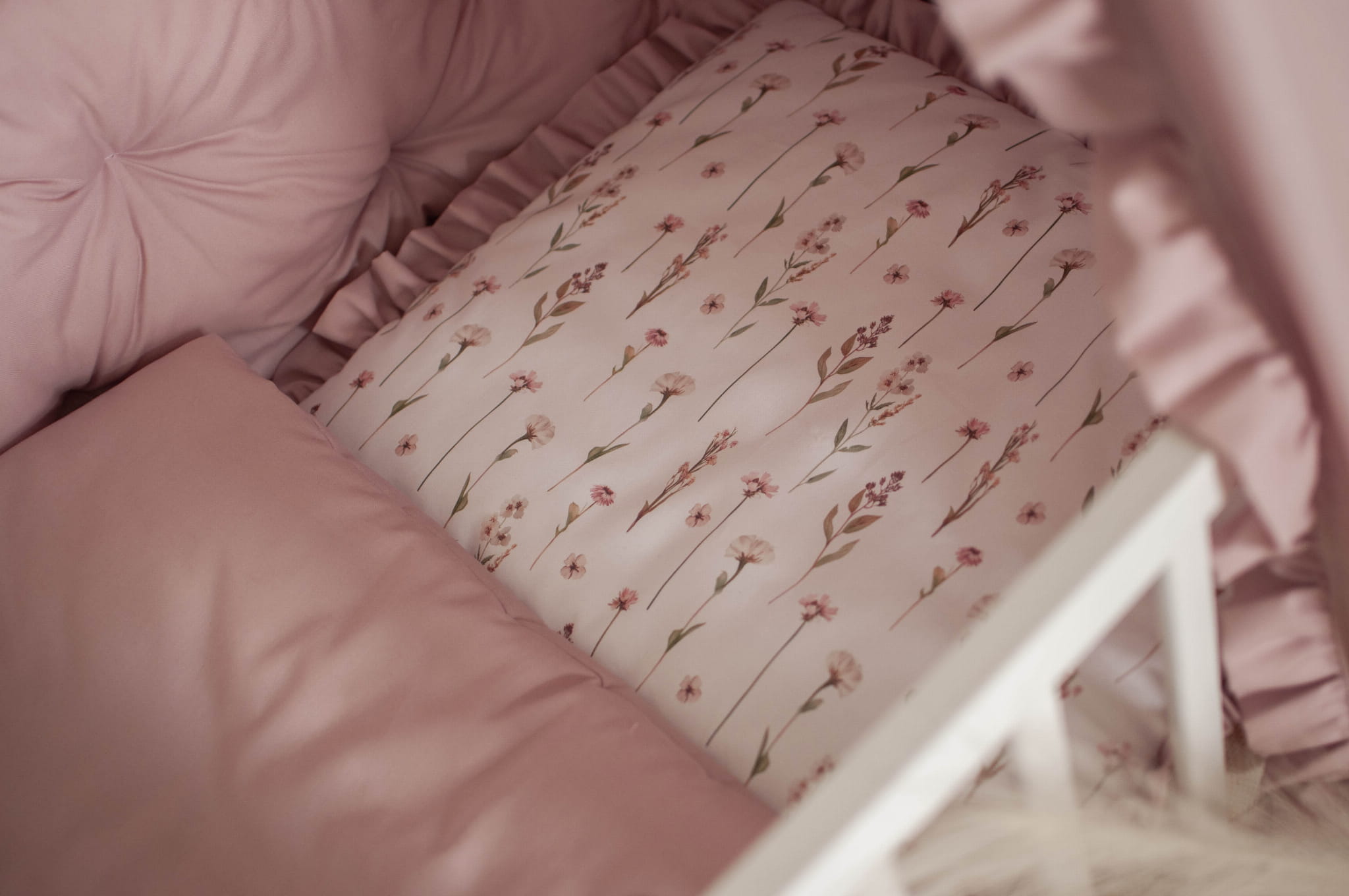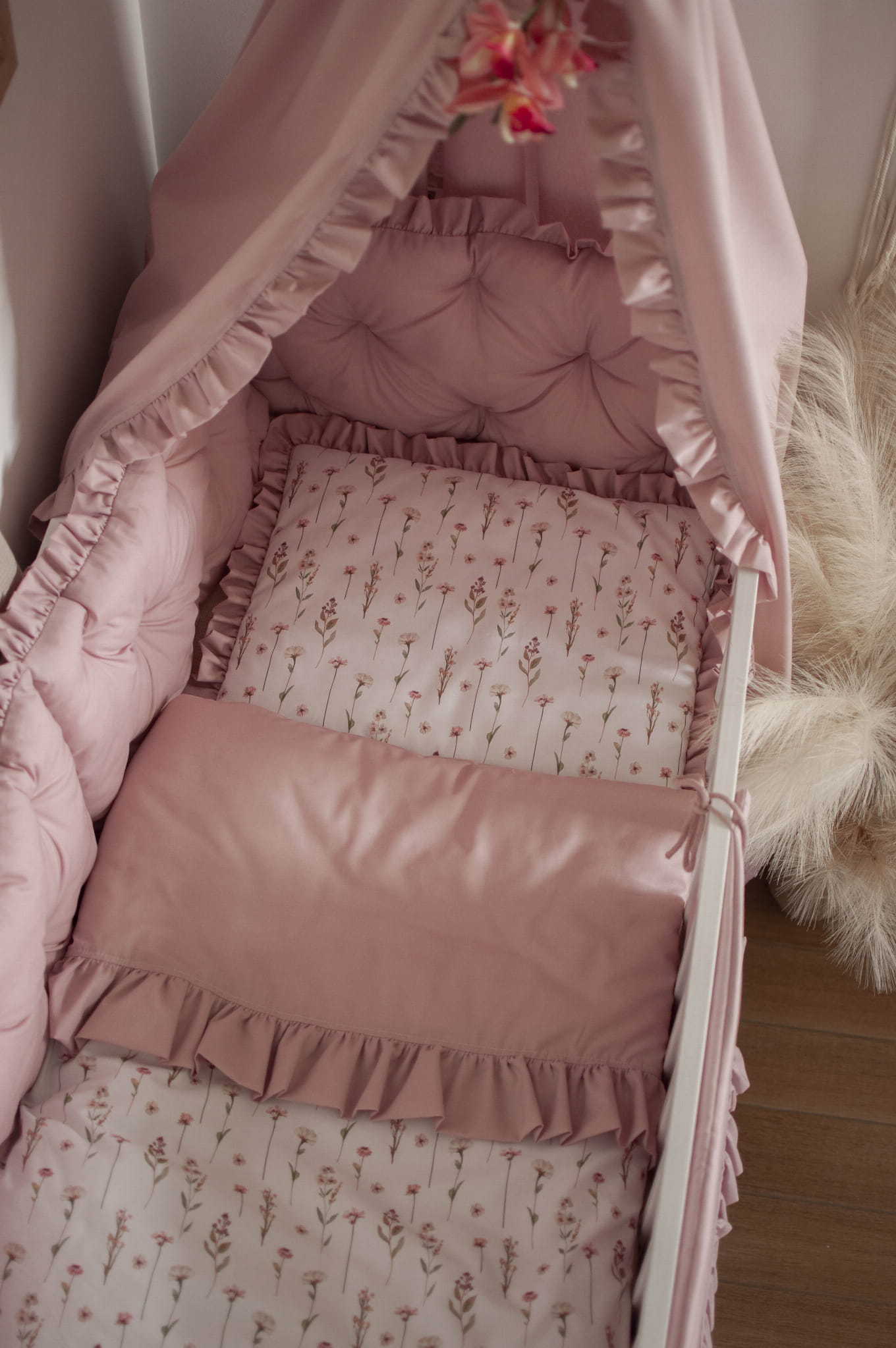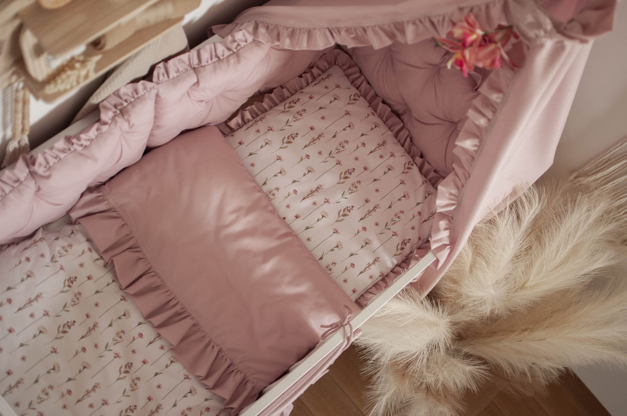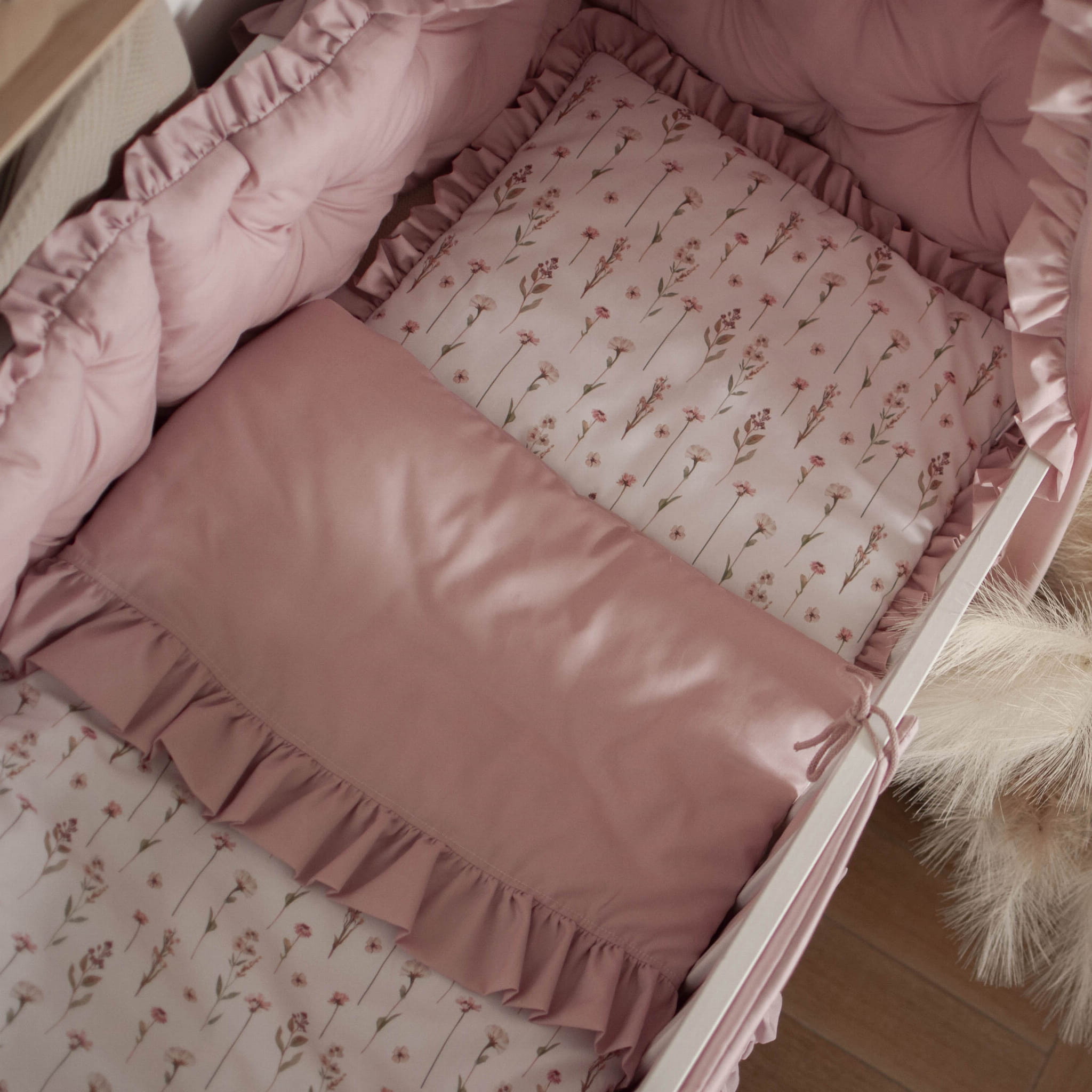 Kołderka z poduszką do łóżeczka z wypełnieniem z falbankami KWIATOWE ECHO + BRUDNY RÓŻ