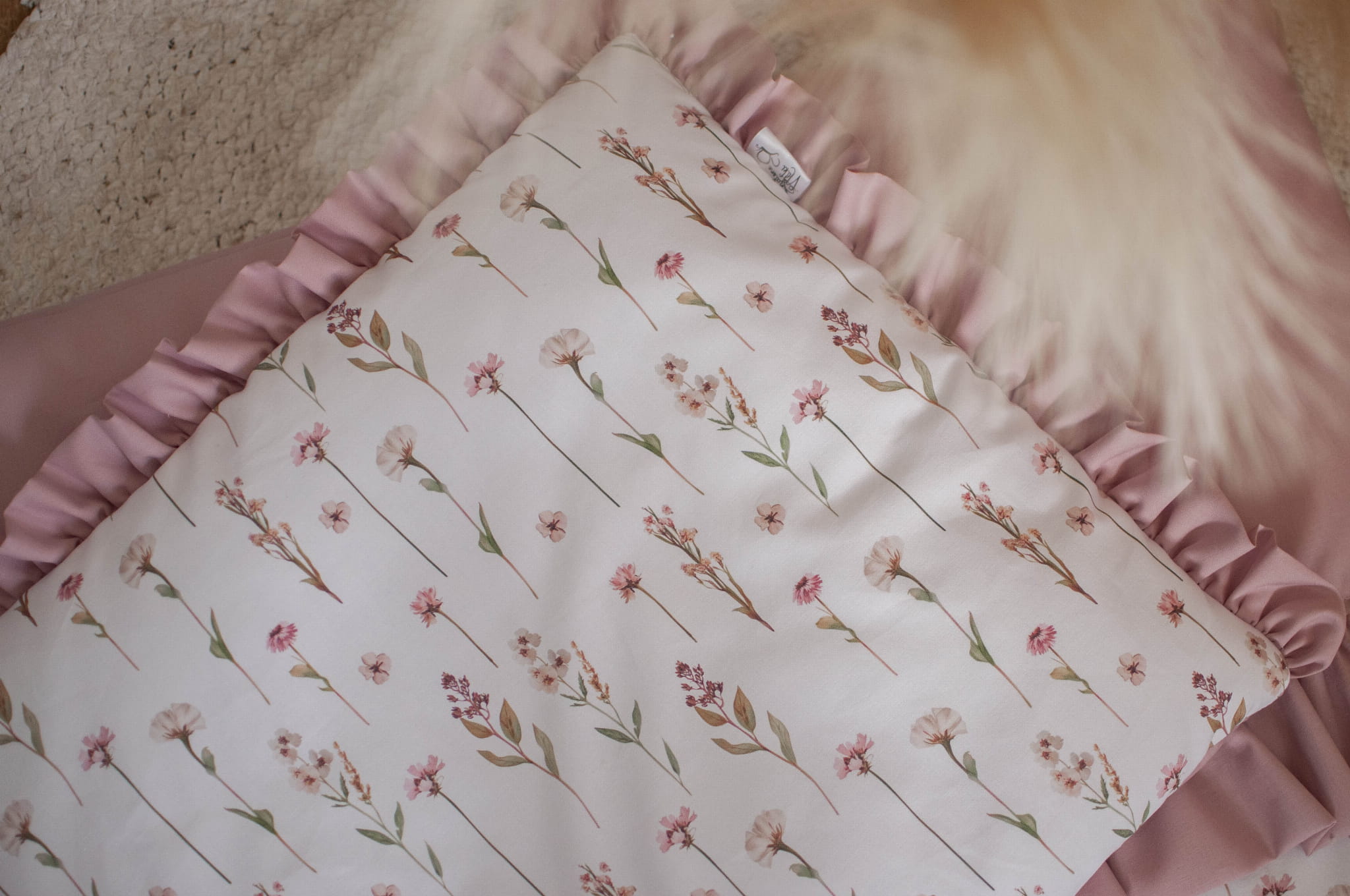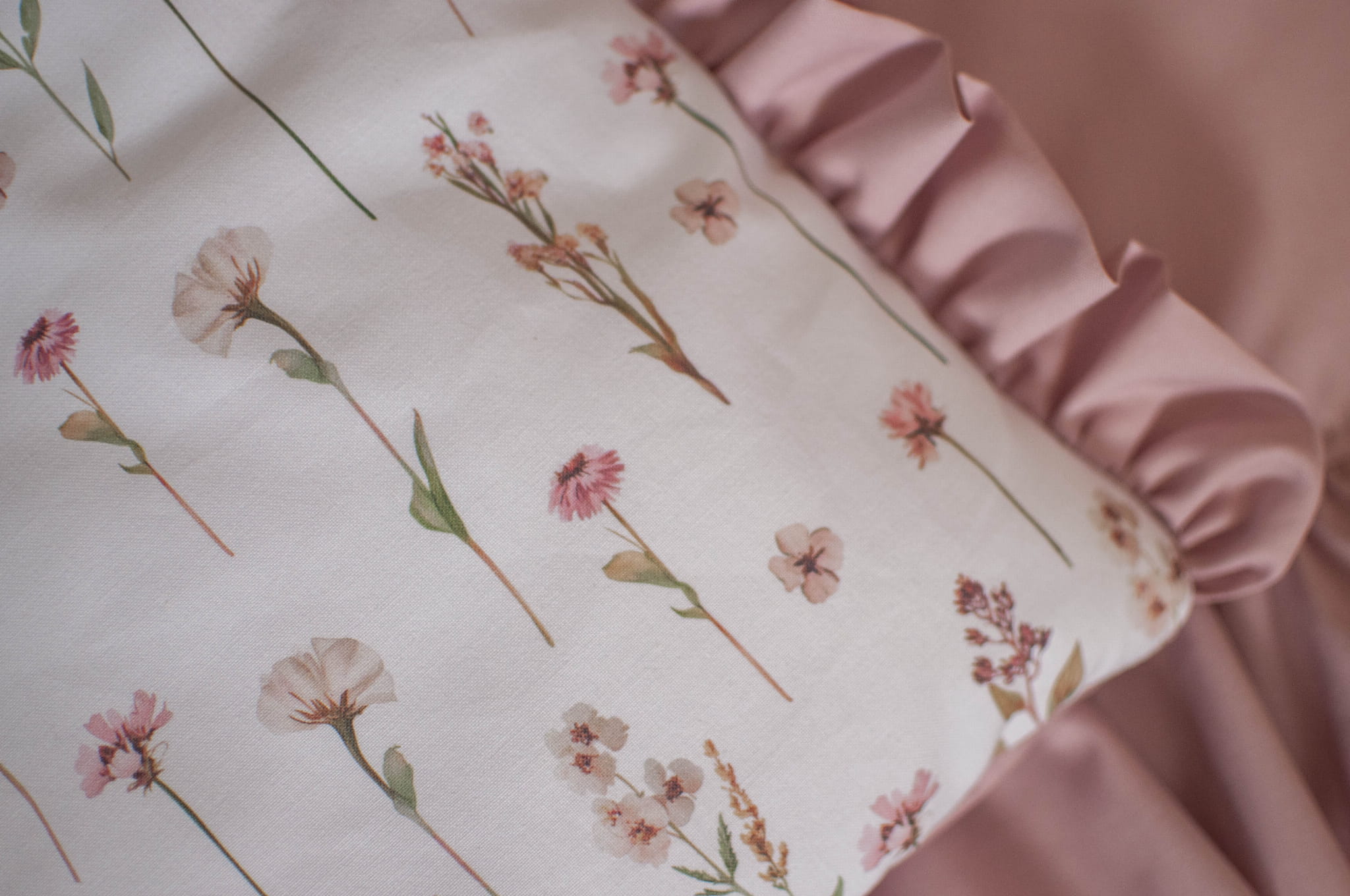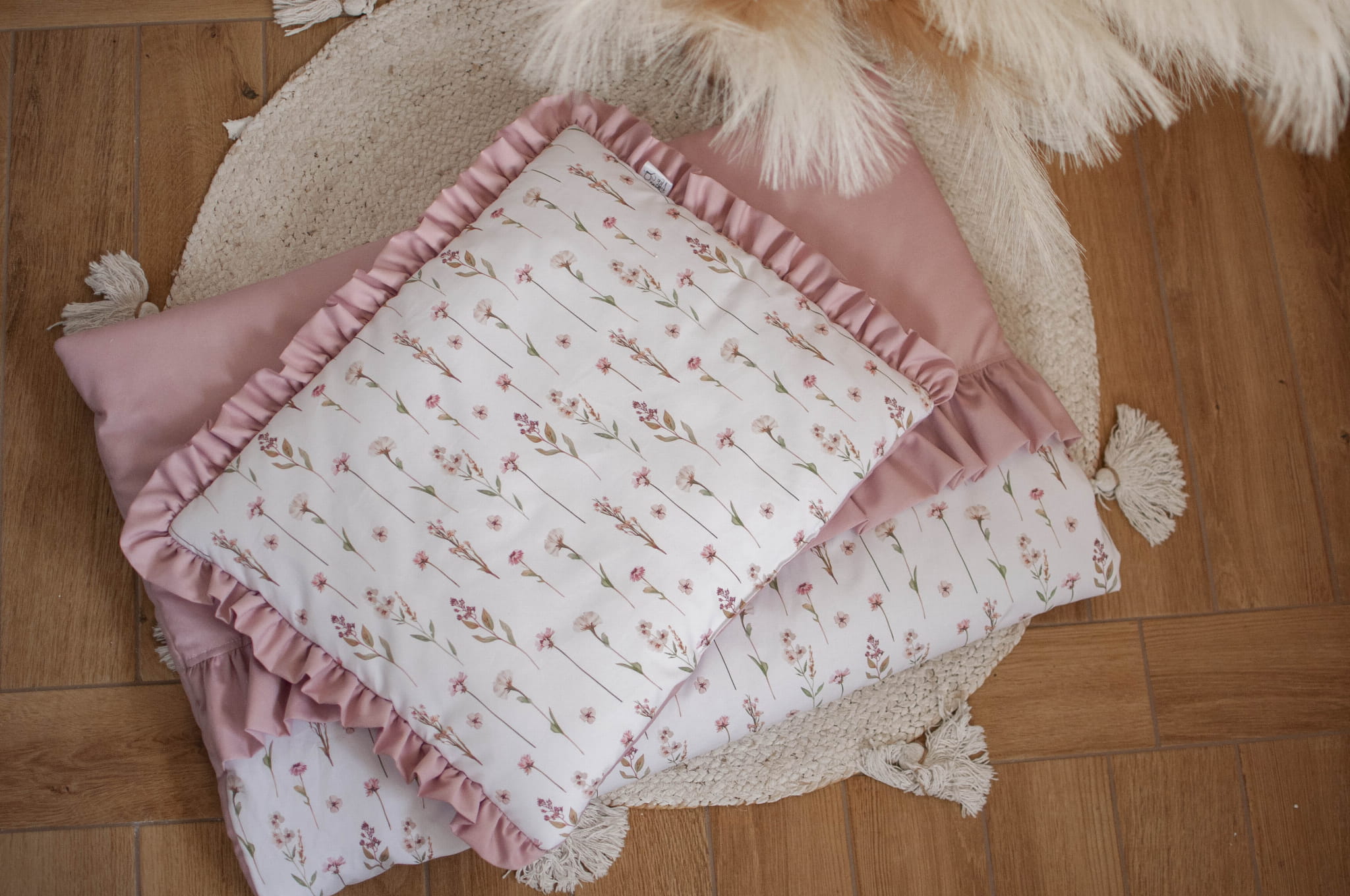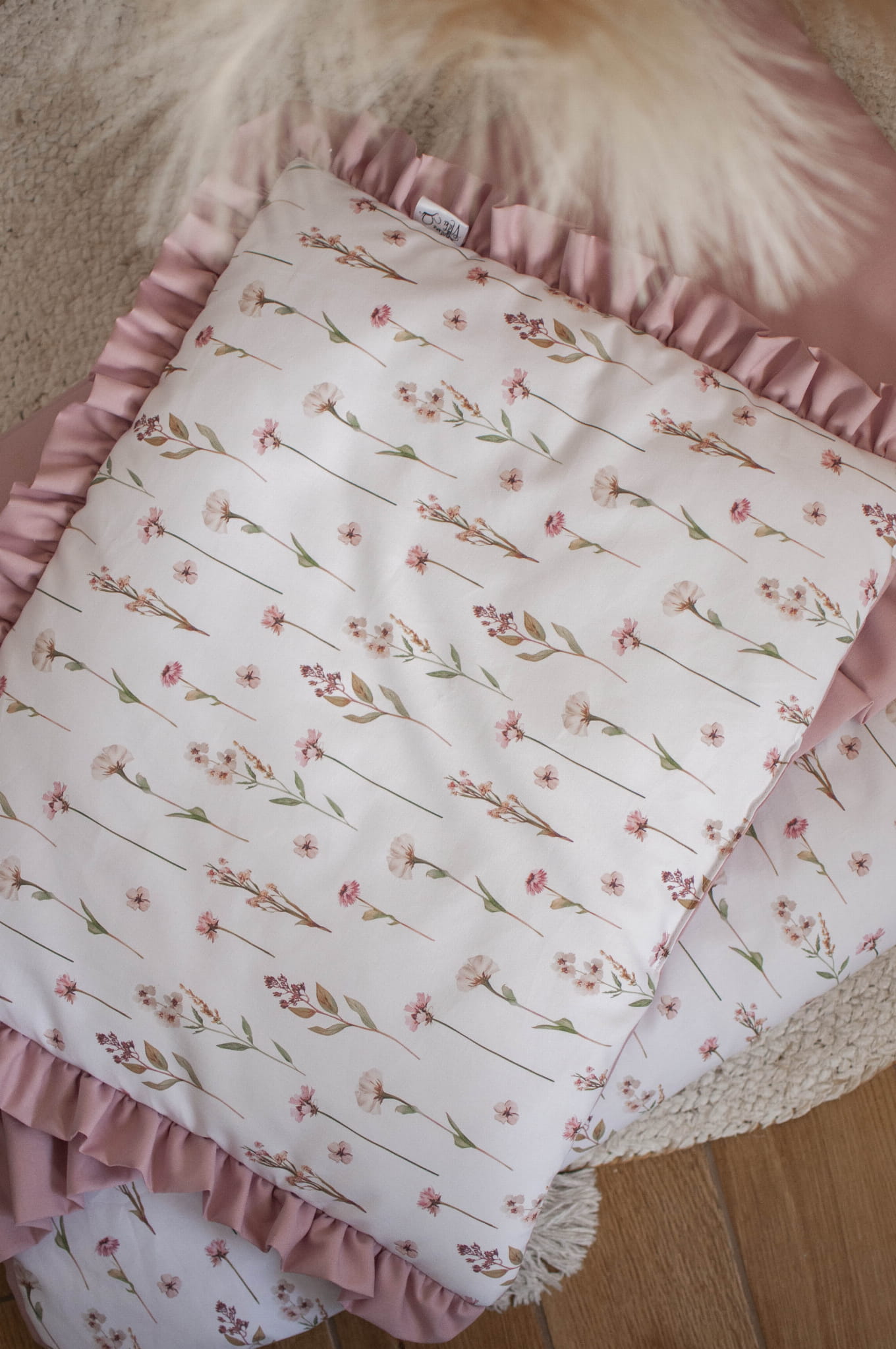 Kołderka z poduszką do łóżeczka z wypełnieniem z falbankami KWIATOWE ECHO + BRUDNY RÓŻ