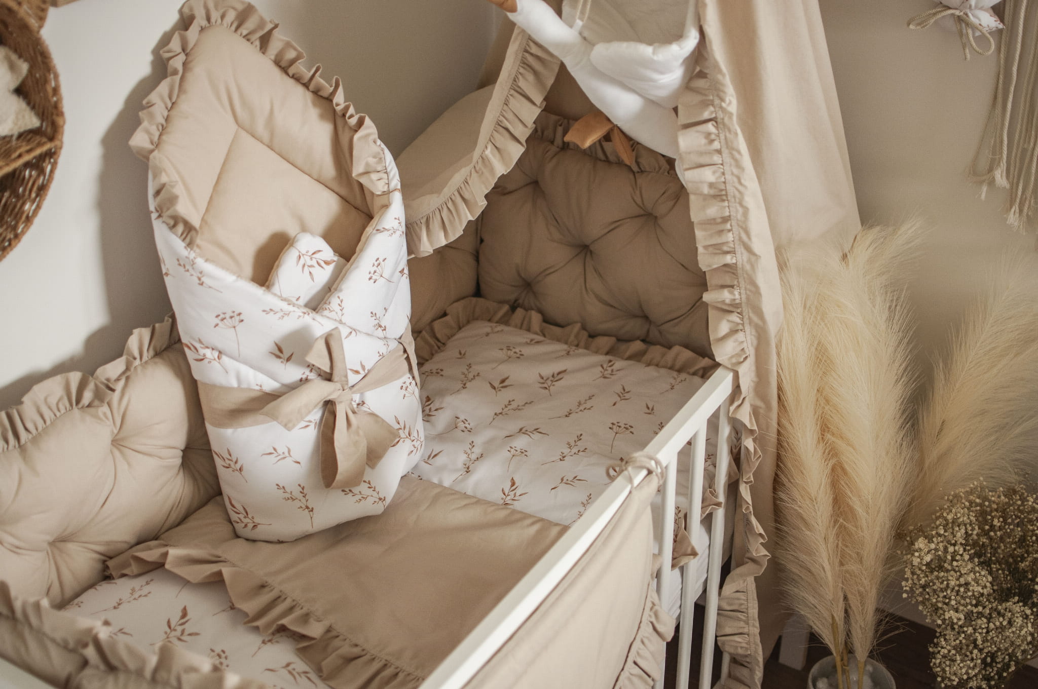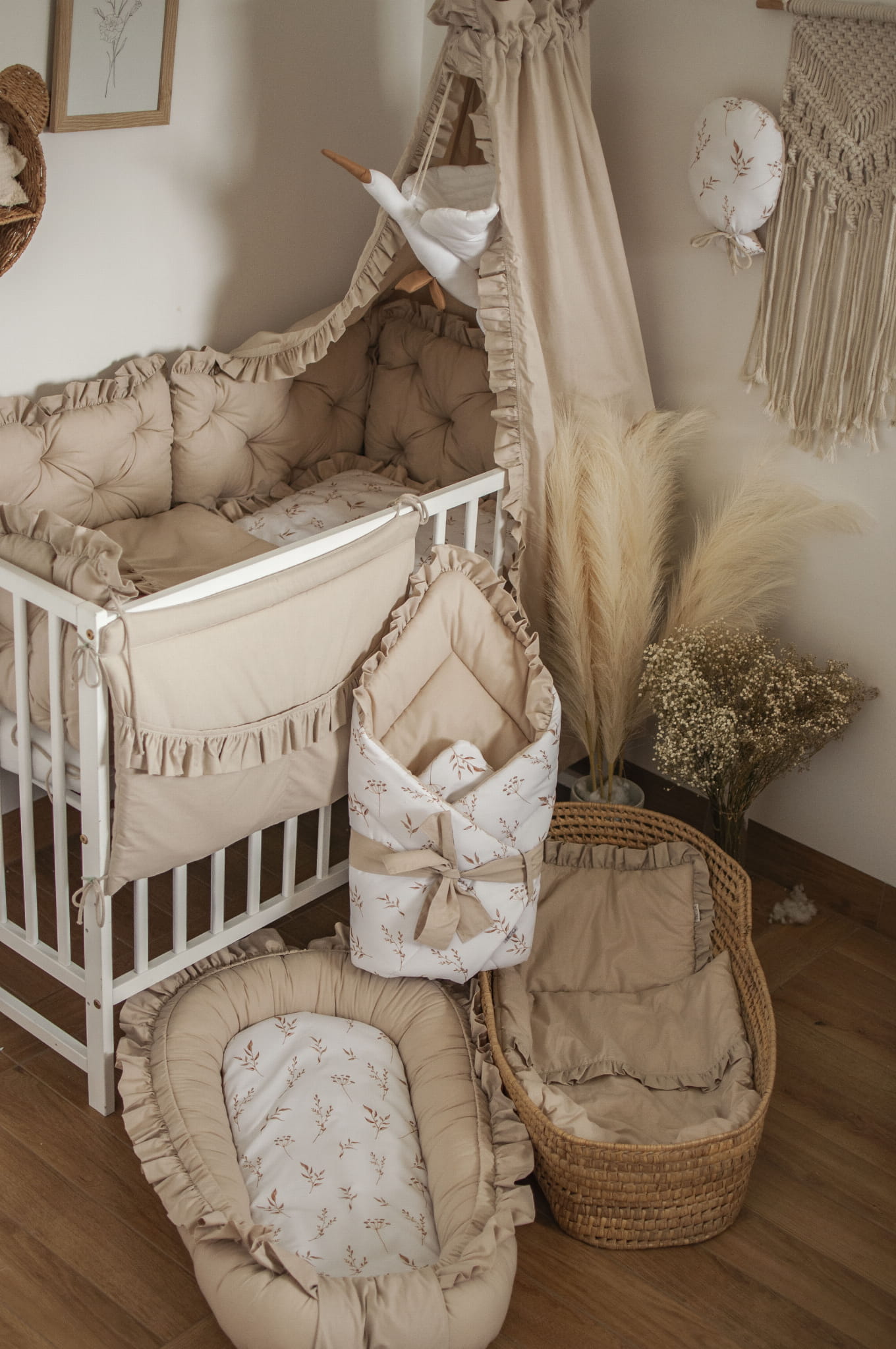W zestawie znajduje się: kokon niemowlęcy z falbankami, materacyk dodatkowy do kokonu, rożek, kołderka z poduszką z wypełnieniem z falbankami do wózka, kołderka z poduszką z wypełnieniem z falbankami do łóżeczka, organizer z falbankami, ochraniacz pikowany z falbankami 180 cm, baldachim z falbankami.