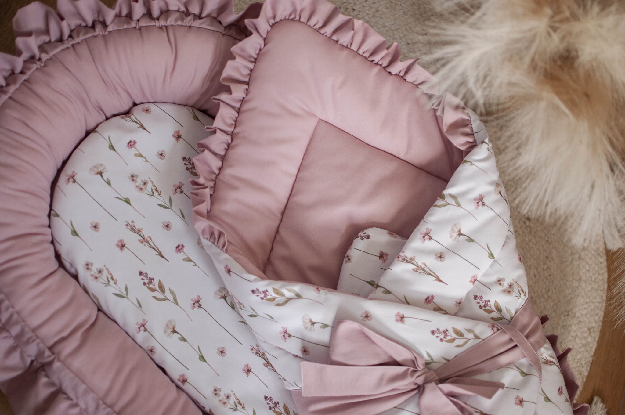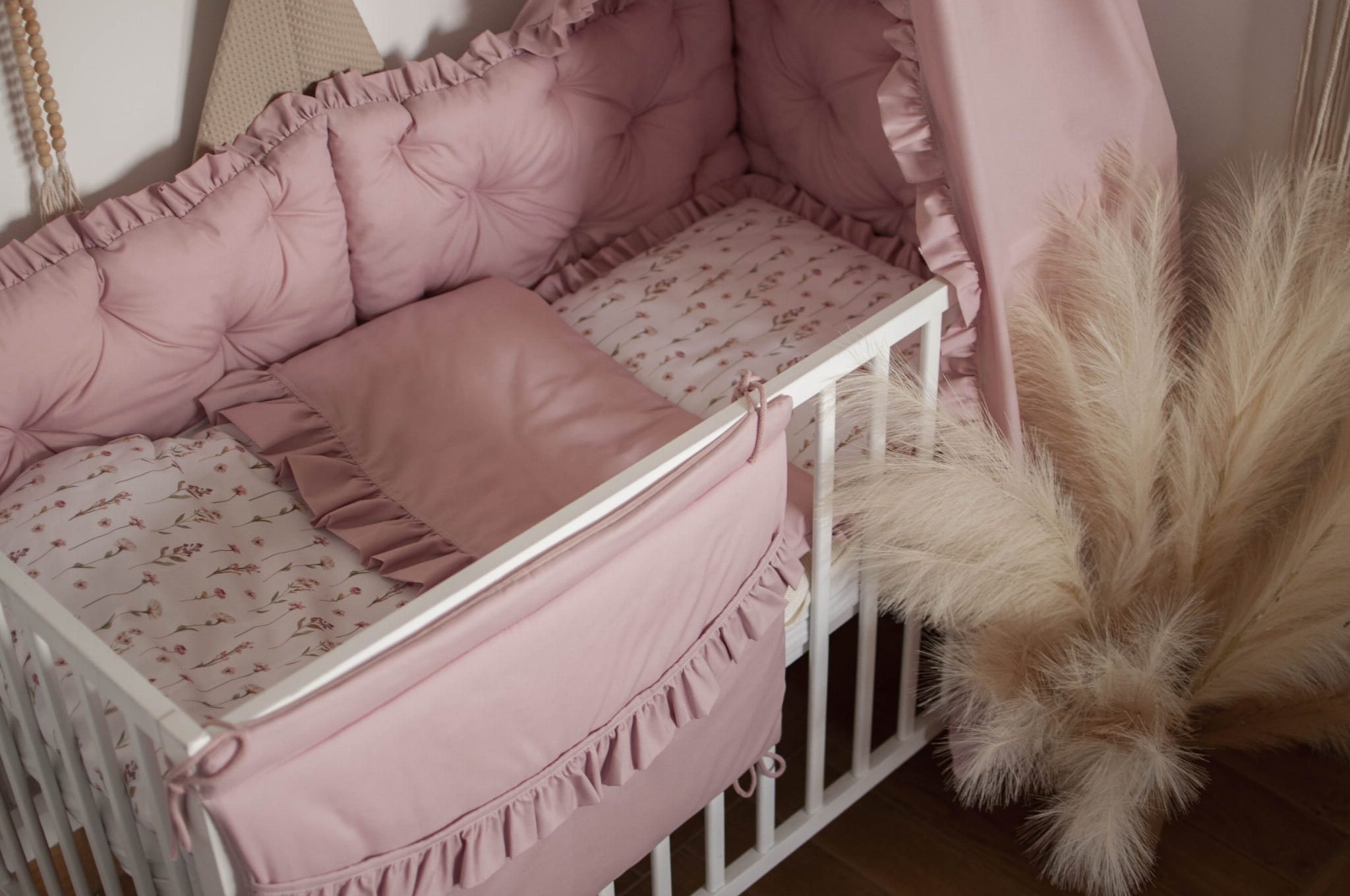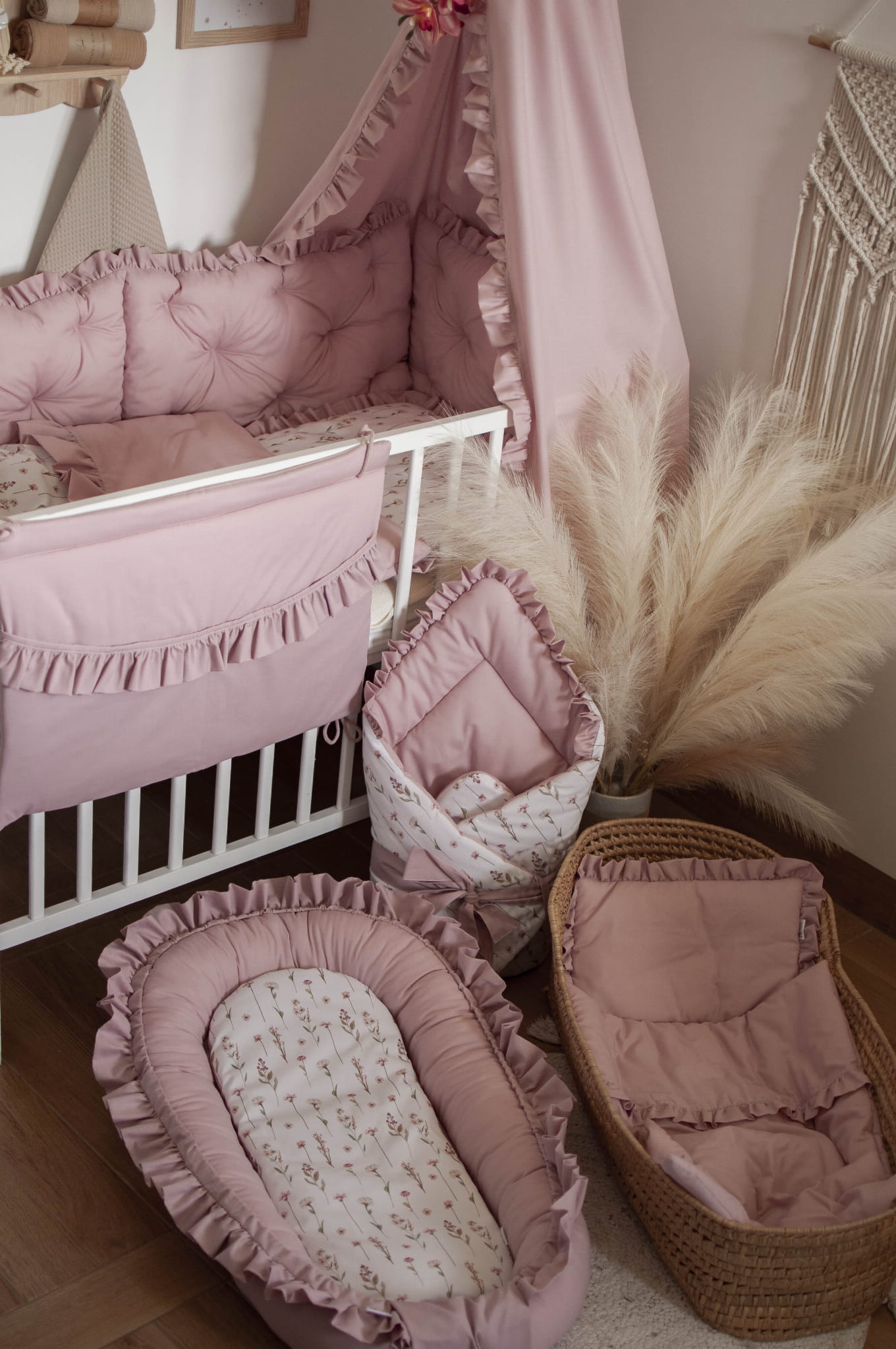 W zestawie znajduje się: kokon niemowlęcy z falbankami, materacyk dodatkowy do kokonu, rożek, kołderka z poduszką z wypełnieniem z falbankami do wózka, kołderka z poduszką z wypełnieniem z falbankami do łóżeczka, organizer z falbankami, ochraniacz pikowany z falbankami 180 cm, baldachim z falbankami.