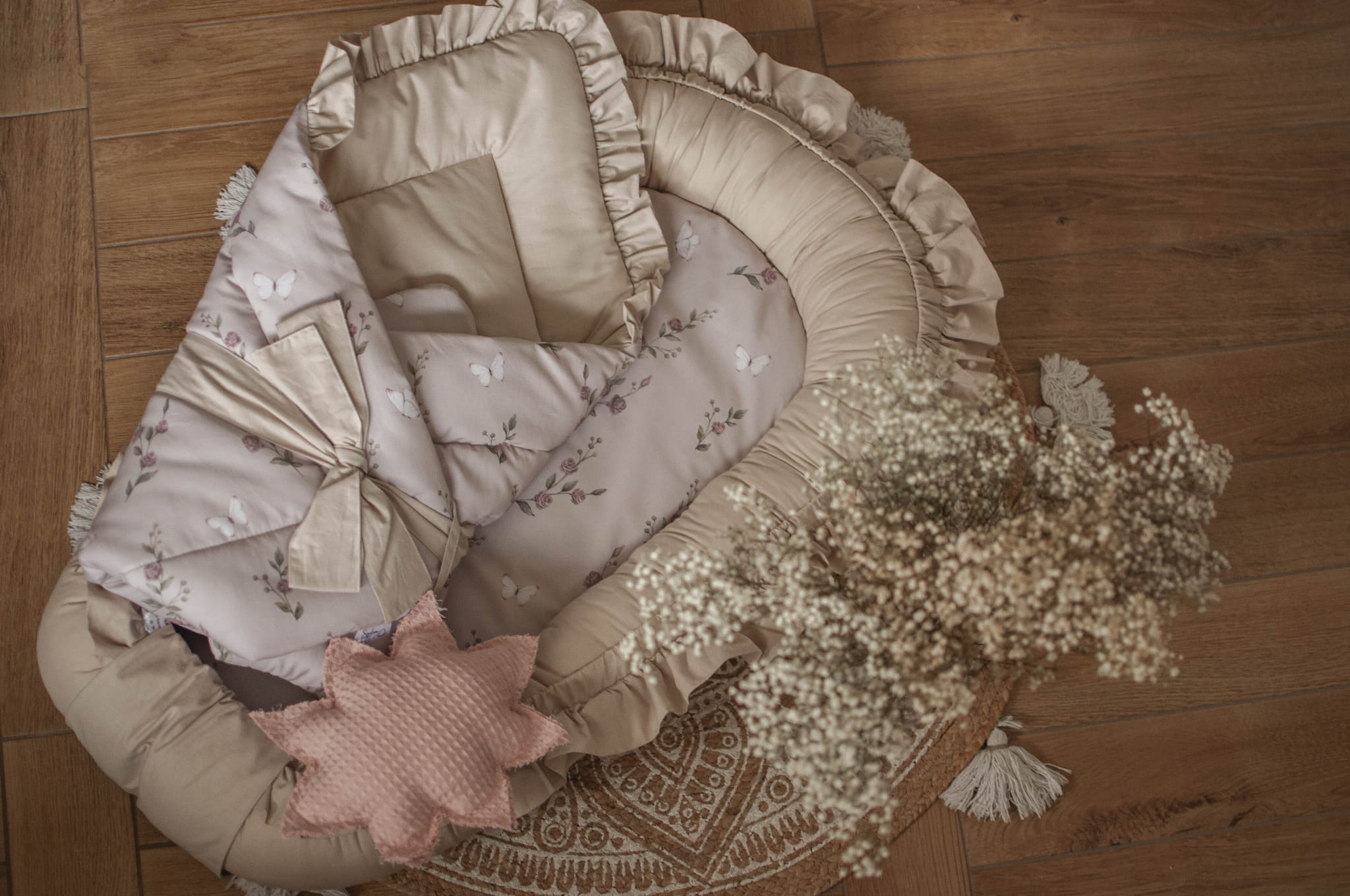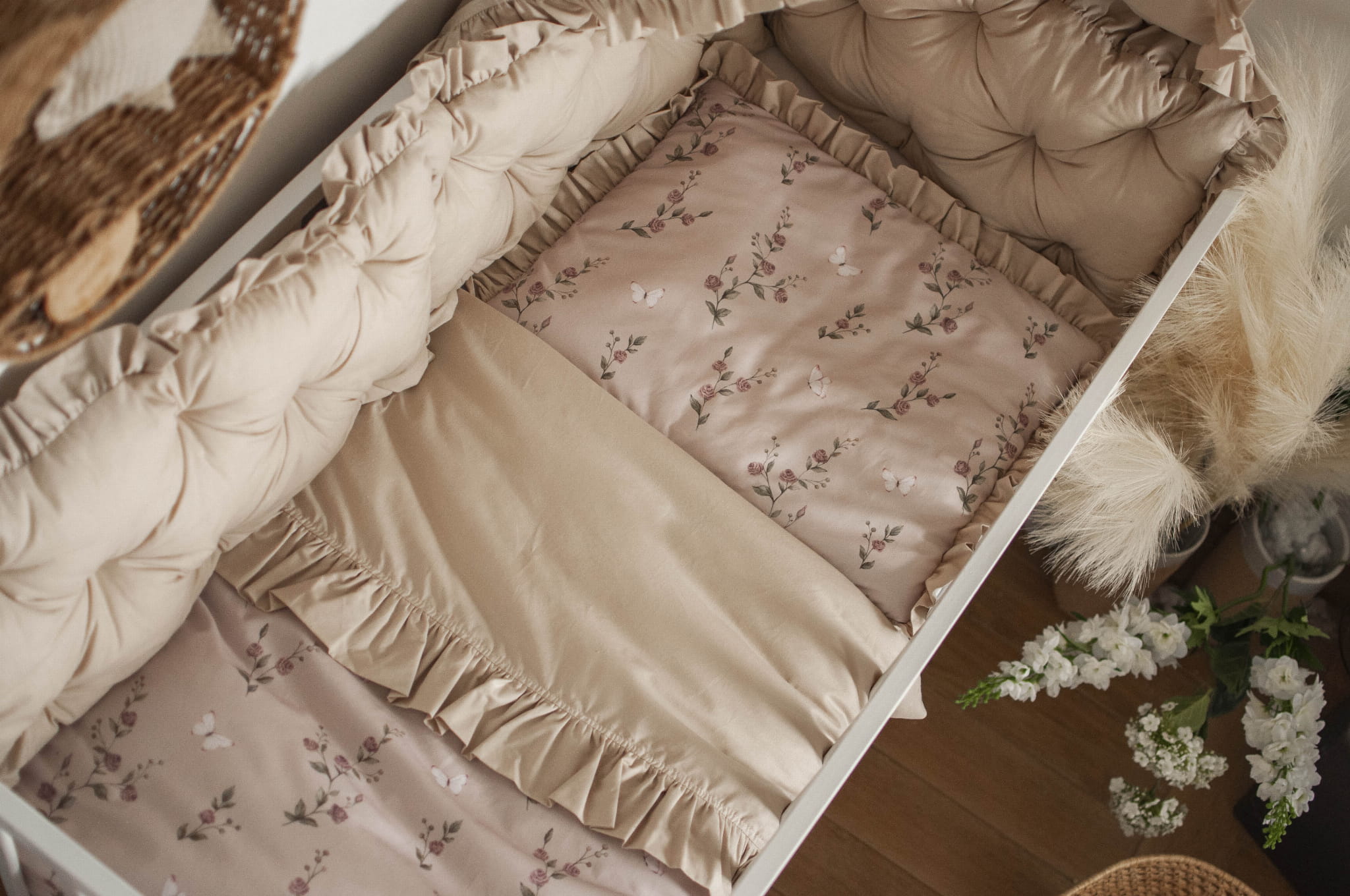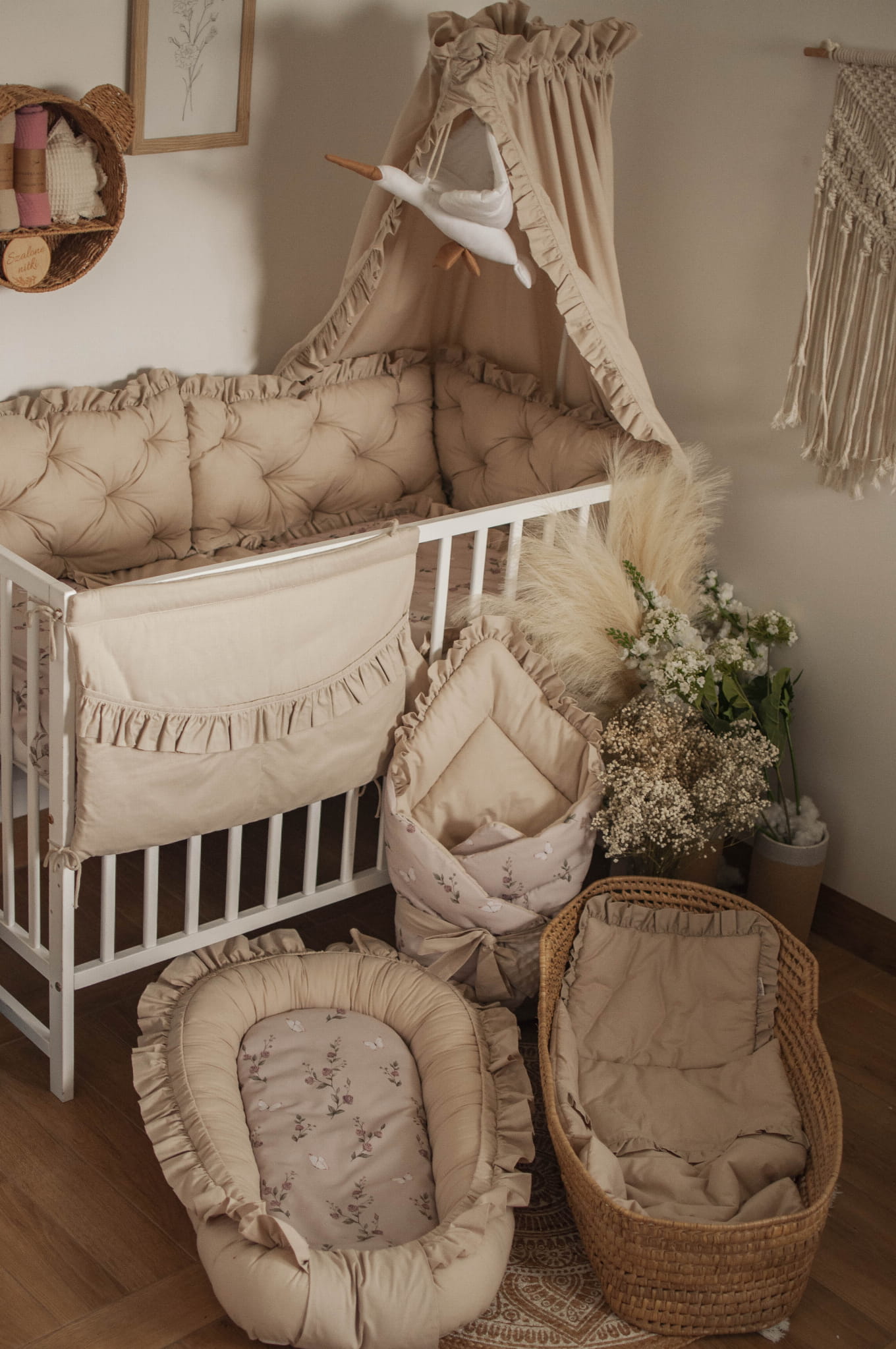 W zestawie znajduje się: kokon niemowlęcy z falbankami, materacyk dodatkowy do kokonu, rożek, kołderka z poduszką z wypełnieniem z falbankami do wózka, kołderka z poduszką z wypełnieniem z falbankami do łóżeczka, organizer z falbankami, ochraniacz pikowany z falbankami 180 cm, baldachim z falbankami.