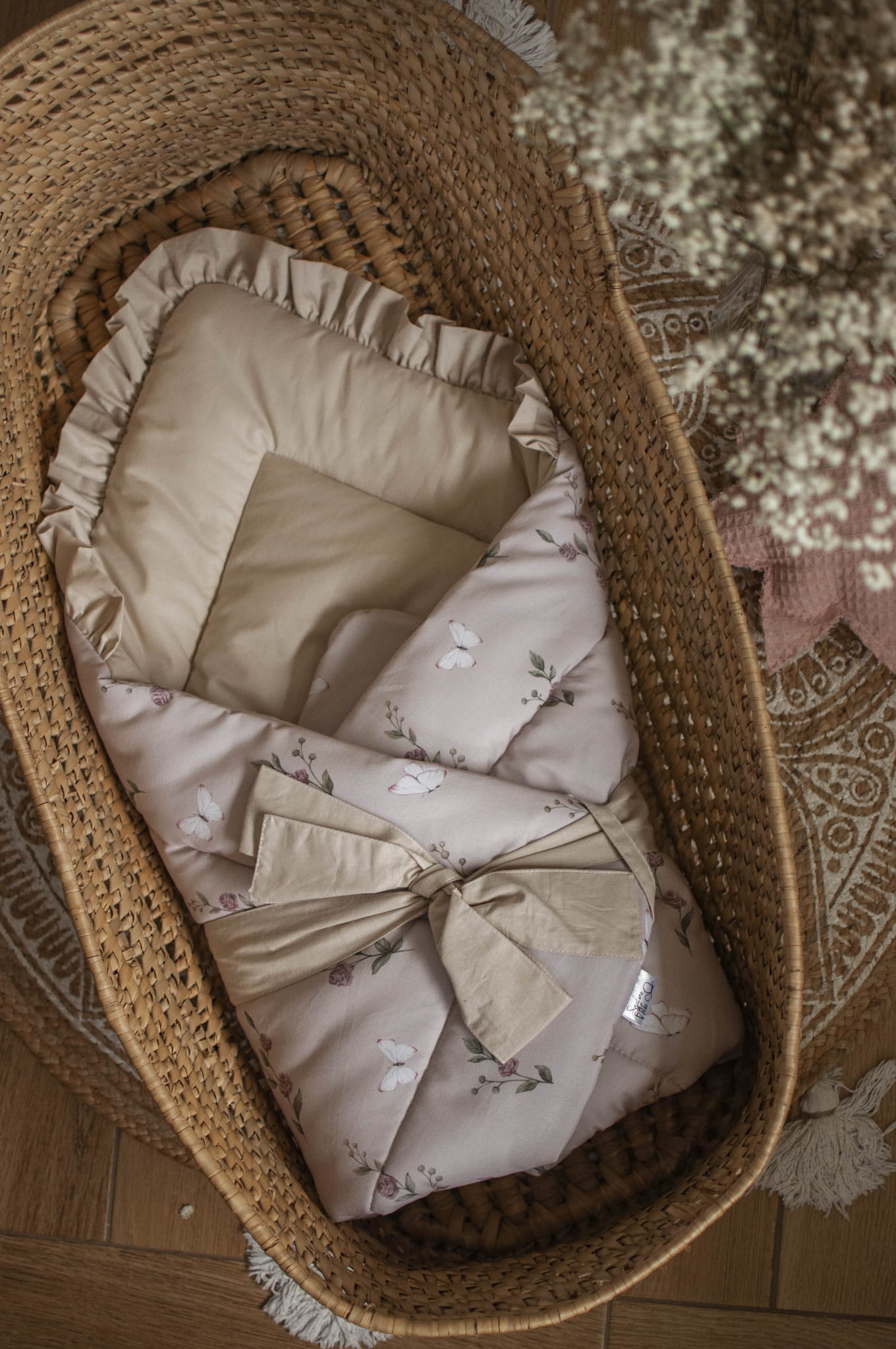 Organizer służy do przechowywania drobnych zabawek, pieluszek, elementów pielęgnacyjnych. Nie służy do zabawy ani przykrywania. Powinien być zawieszony po zewnętrznej stronie łóżeczka i przywiązany sznureczkami. Szurki powinny być zawiązane na kokardki.