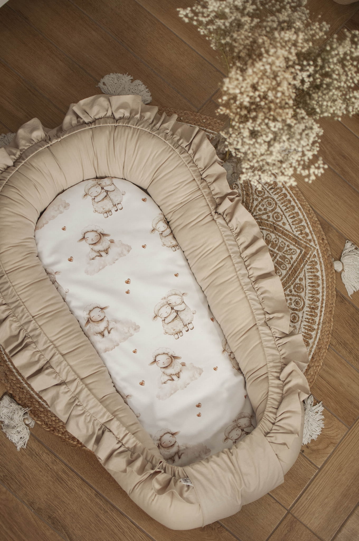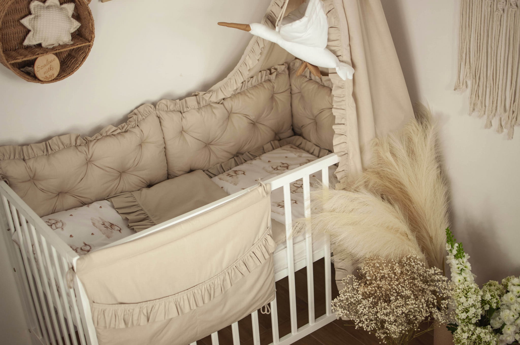 Organizer służy do przechowywania drobnych zabawek, pieluszek, elementów pielęgnacyjnych. Nie służy do zabawy ani przykrywania. Powinien być zawieszony po zewnętrznej stronie łóżeczka i przywiązany sznureczkami. Szurki powinny być zawiązane na kokardki.