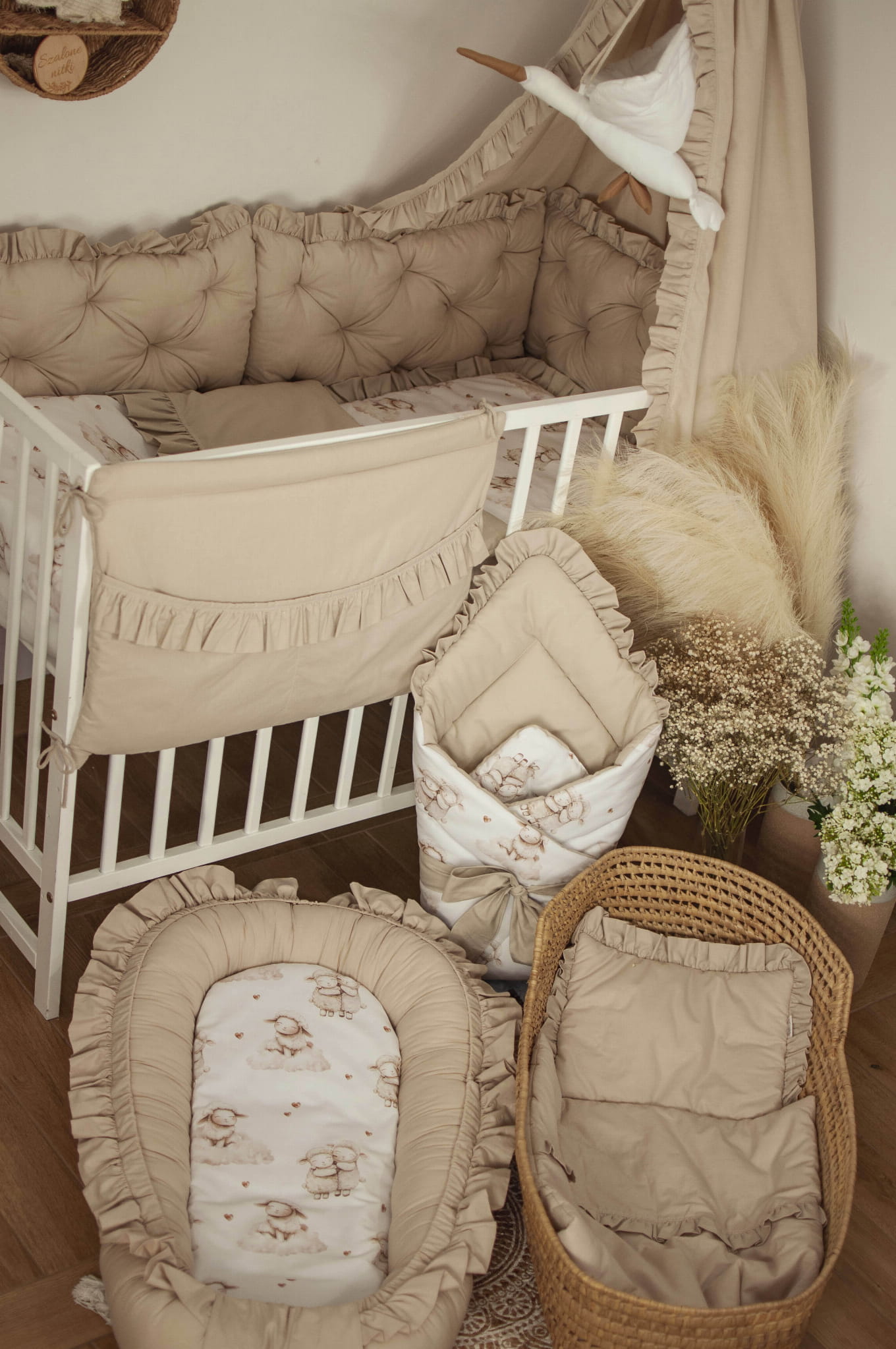 W zestawie znajduje się: kokon niemowlęcy z falbankami, materacyk dodatkowy do kokonu, rożek, kołderka z poduszką z wypełnieniem z falbankami do wózka, kołderka z poduszką z wypełnieniem z falbankami do łóżeczka, organizer z falbankami, ochraniacz pikowany z falbankami 180 cm, baldachim z falbankami.