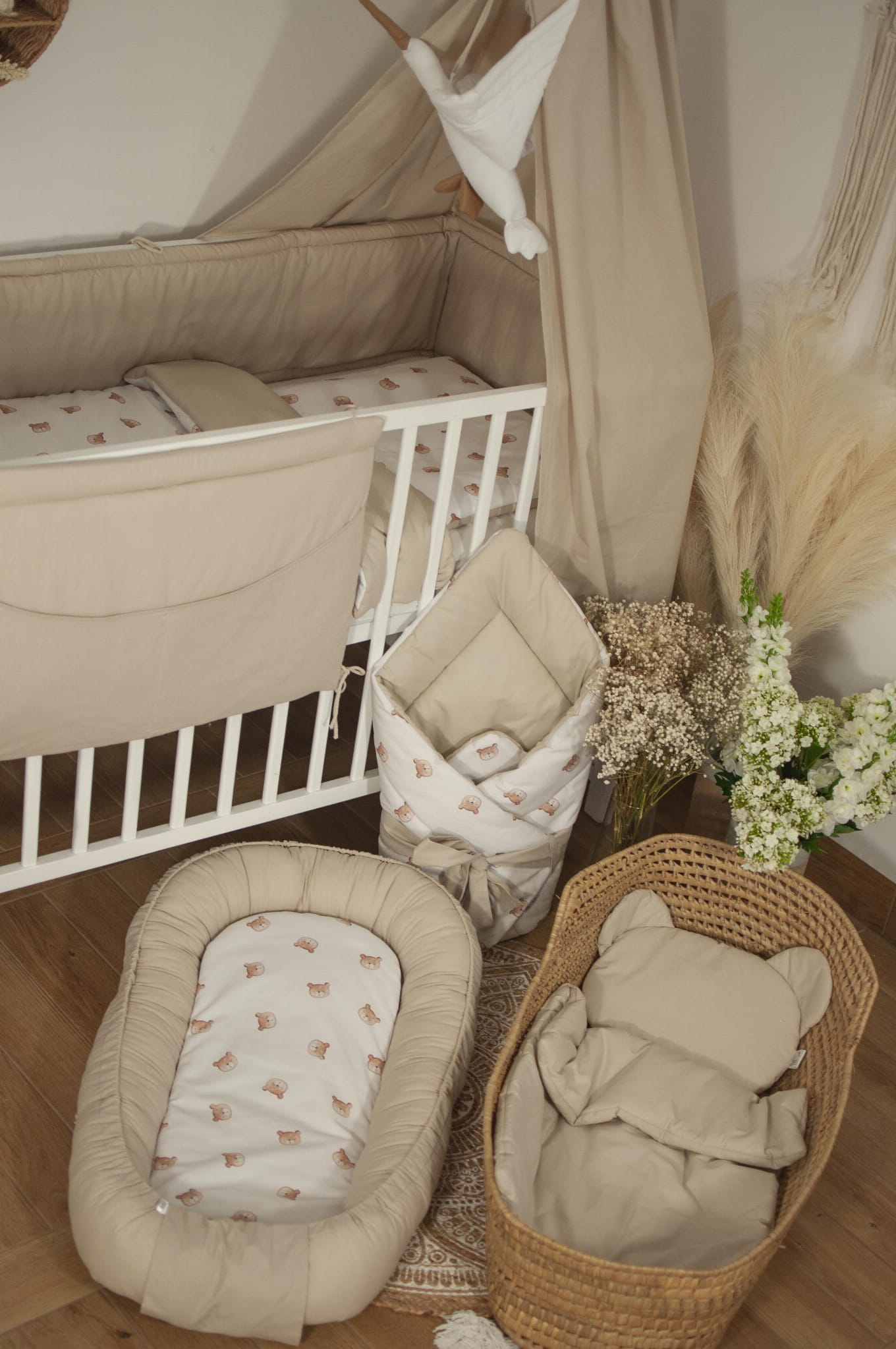 W zestawie znajduje się: BALDACHIM bez stelaża//KOŁDERKA Z PODUSZKĄ z wypełnieniem DO ŁÓŻECZKA//OCHRANIACZ PŁASKI na szczebelki 180 CM//ORGANIZER na szczebelki//KOKON//MATERACYK//ROŻEK//KOŁDERKA Z PODUSZKĄ z wypełnieniem DO WÓZKA