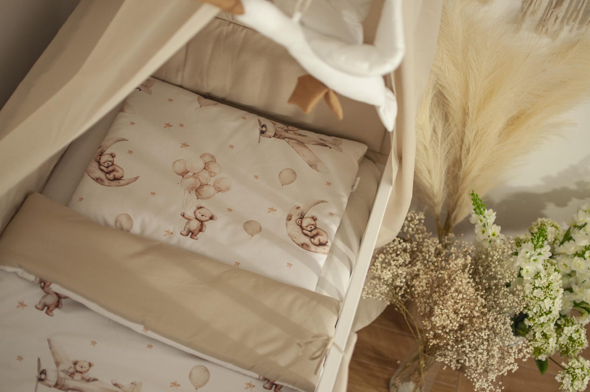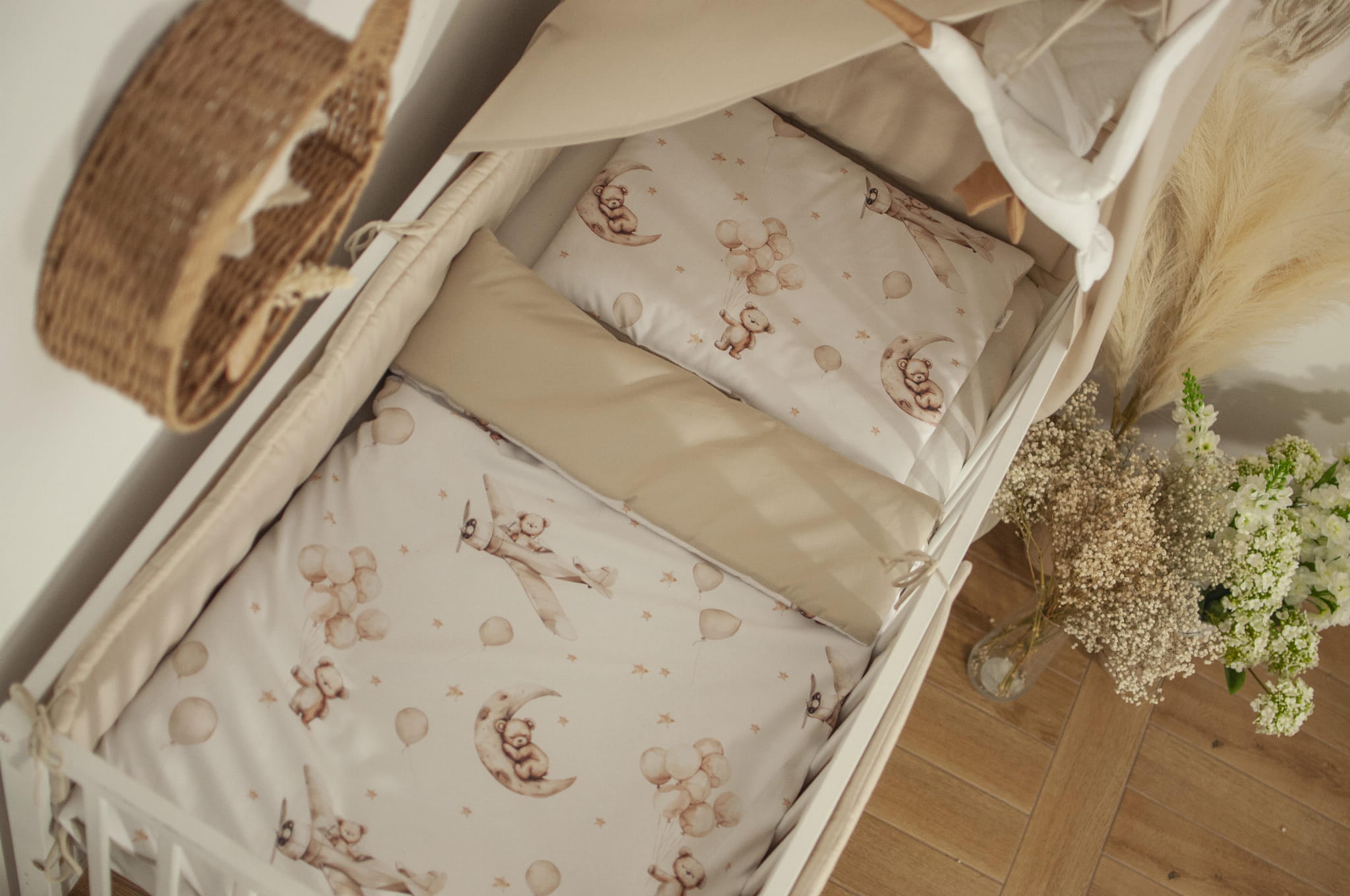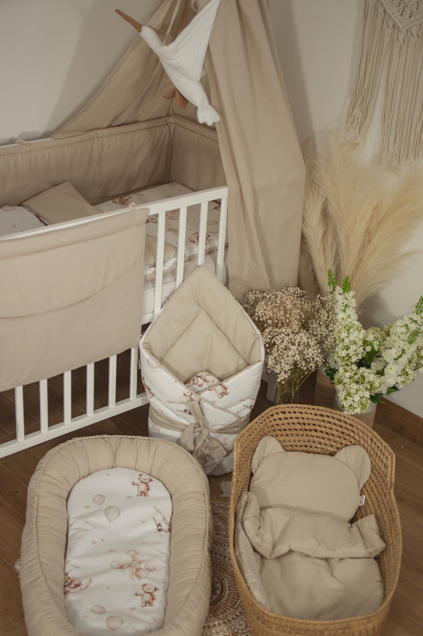 W zestawie znajduje się: BALDACHIM bez stelaża//KOŁDERKA Z PODUSZKĄ z wypełnieniem DO ŁÓŻECZKA//OCHRANIACZ PŁASKI na szczebelki 180 CM//ORGANIZER na szczebelki//KOKON//MATERACYK//ROŻEK//KOŁDERKA Z PODUSZKĄ z wypełnieniem DO WÓZKA
