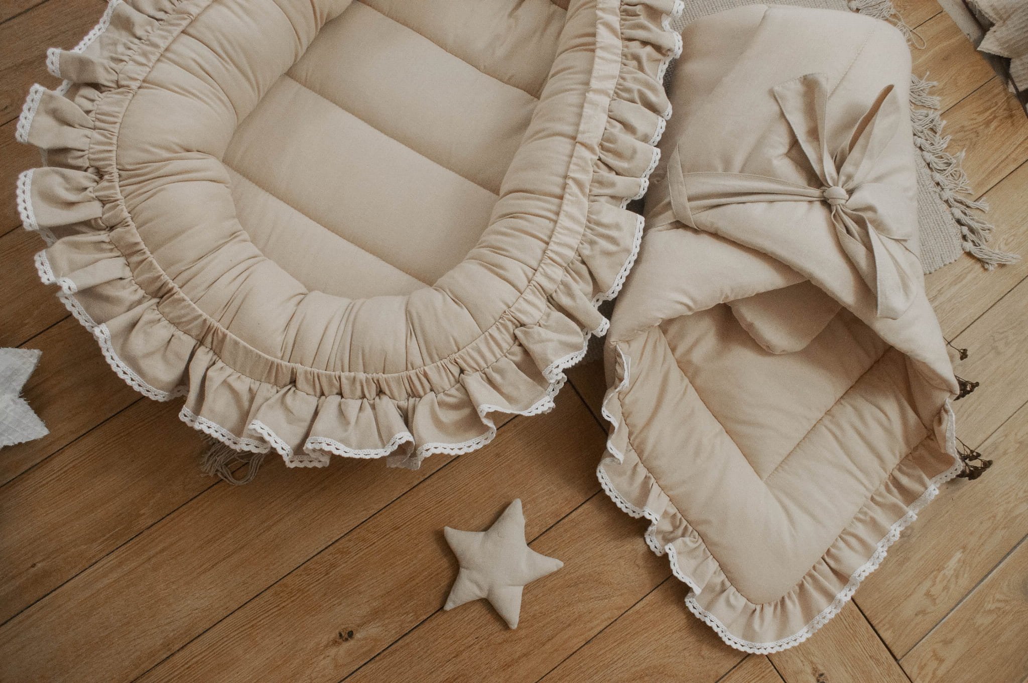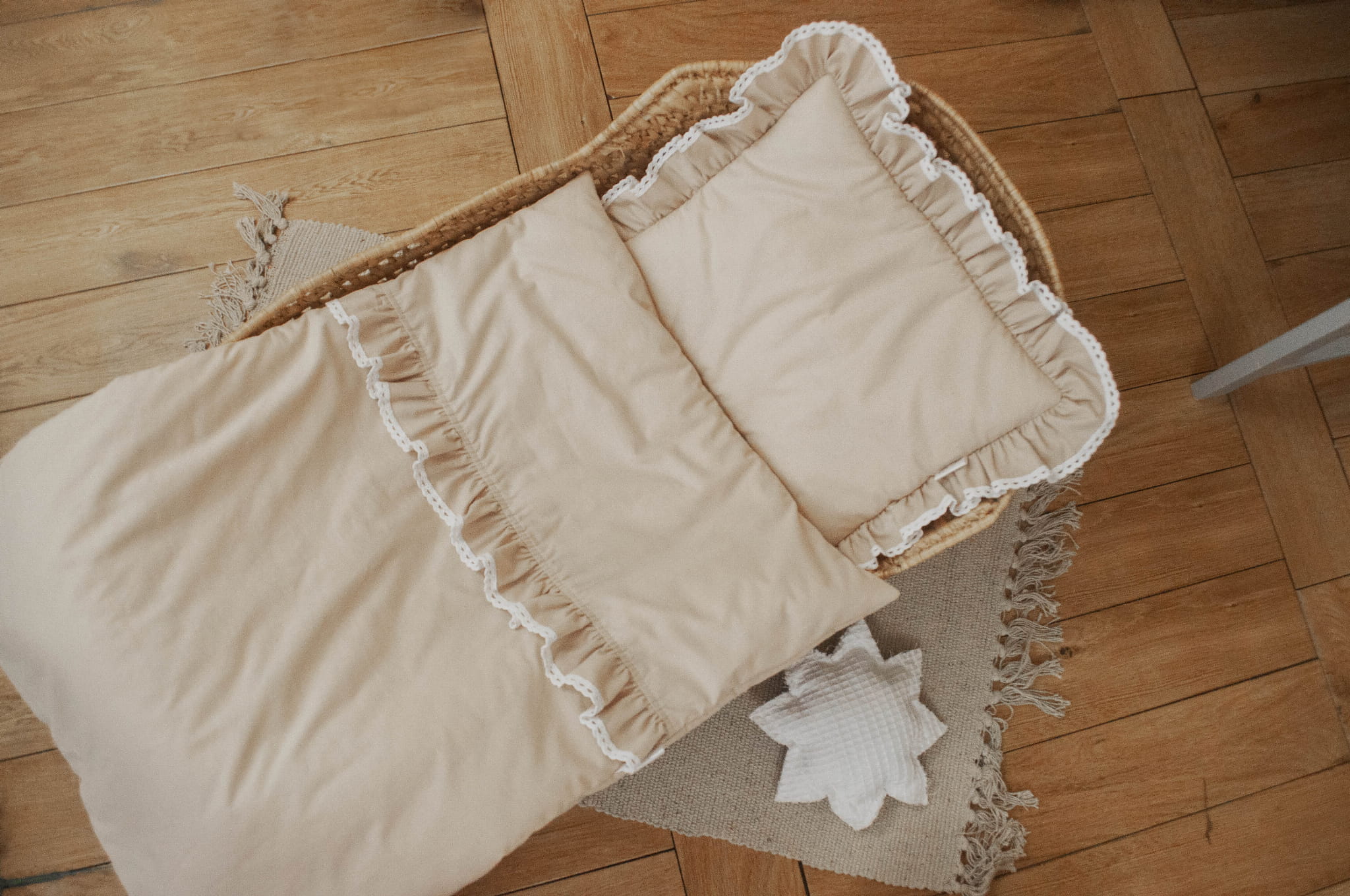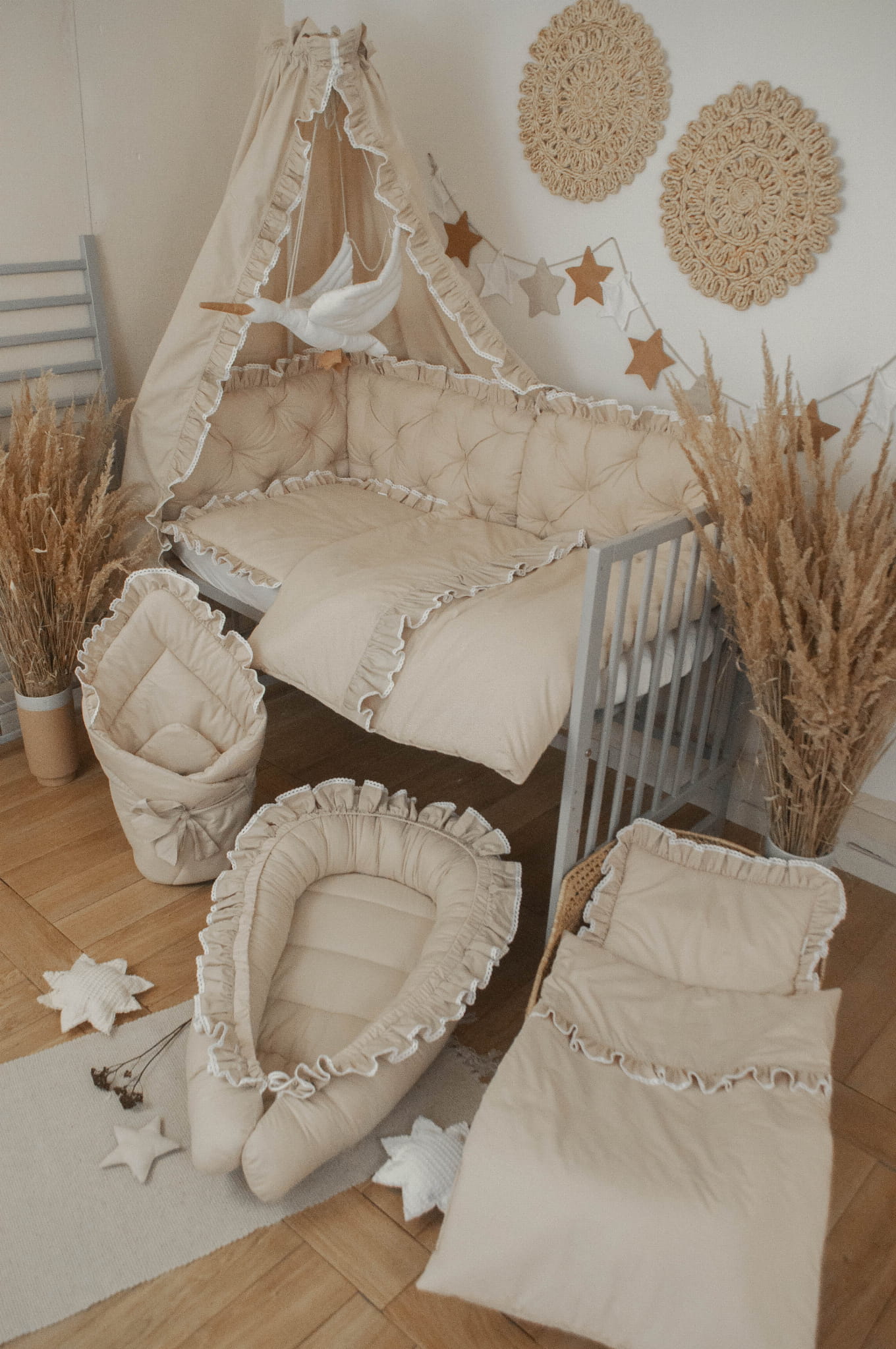 W zestawie znajduje się: kokon niemowlęcy, rożek, kołderka z poduszką z wypełnieniem do wózka, kołderka z poduszką z wypełnieniem do łóżeczka, ochraniacz pikowany 3 panele, baldachim, organizer (nie ma go na zdjęciu ale jest w zestawie)