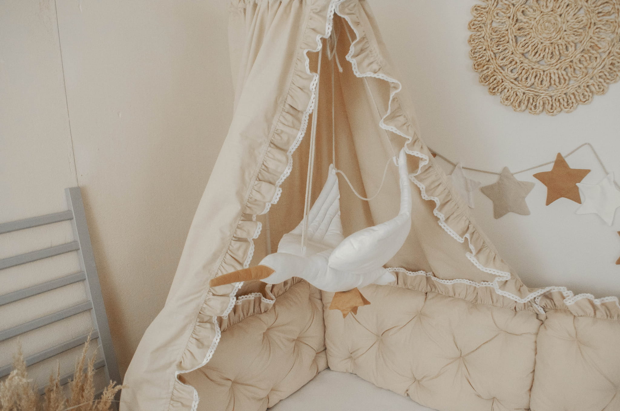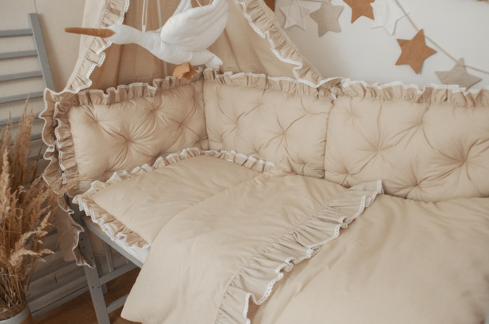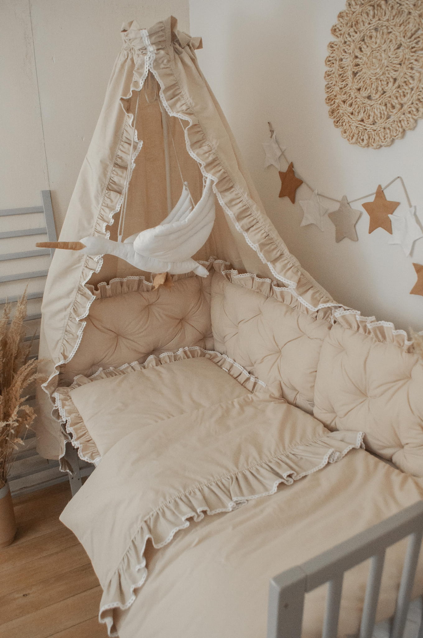 Zestaw nie zawiera gąski, prześcieradła i stelaża do baldachimu oraz dekoracji.