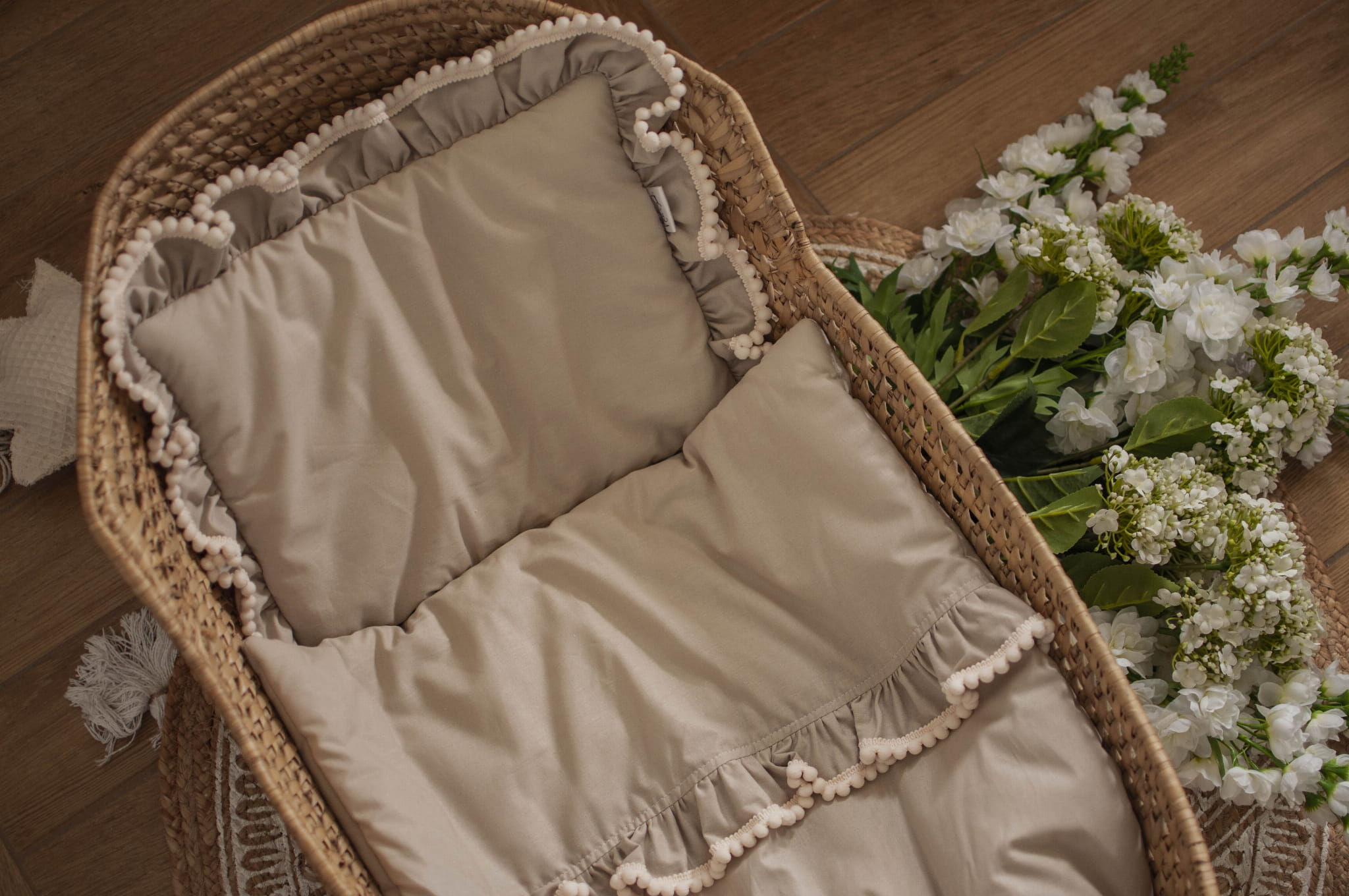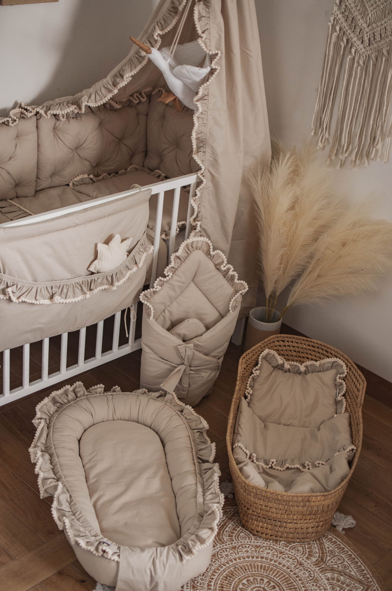 W zestawie znajduje się: kokon niemowlęcy, rożek, kołderka z poduszką z wypełnieniem do wózka, kołderka z poduszką z wypełnieniem do łóżeczka, ochraniacz pikowany 3 panele, baldachim, organizer, materacyk do kokona.