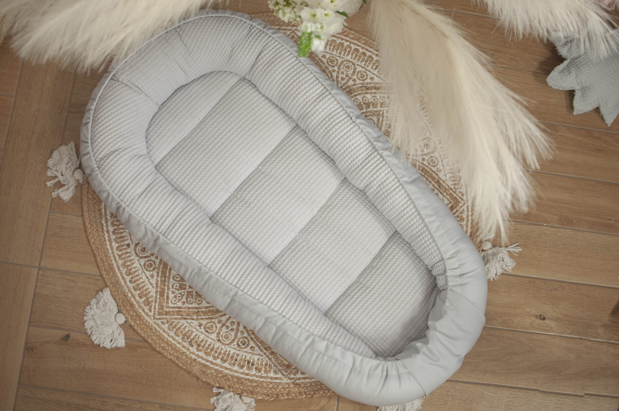 Obydwa pytania mają podobną odpowiedź stąd opiszemy je razem. Szalone nitki szyją jeden wymiar kokonu ze względu na jego fukcjonalność. Wychowaliśmy w kokonach swoje dzieci i dobrze wiemy, że kiedy maluszek zaczyna robić się ruchliwy i wkracza w fazę poruszania to żadna siła, w tym też kokon go nie zatrzyma. Ciekawość świata bierze górę więc w ciągu dnia bardziej atrakcyjna od kokona staje się podłoga i możliwość odkrywania nowych elementów otaczającego świata. Przez to kokon idzie w odstawkę, staje się miejscem już wyłącznie na drzemkę. Spokojnie starcza do około 6 miesięcy życia a kiedy legowisko staje się za krótkie w formie związanej można używać go dalej w postaci rozwiązanej. Większy bobas nie potrzebuje już takiego ograniczania więc wiązanie nie wpływa na jego bezpieczeństwo a rozwiązanie powiększa przestrzeń do snu. Kokon niemowlęcy Szalone nitki można również używać w łożeczku zamiast ochraniacza. Jest to dobra alternatywa dla ochraniaczy, które w momencie obracania czy słodkich piruecików są niestety koniecznością. Tutaj spokojnie tą funkcję spełni rozwiązany kokon umieszczony w łóżeczku.