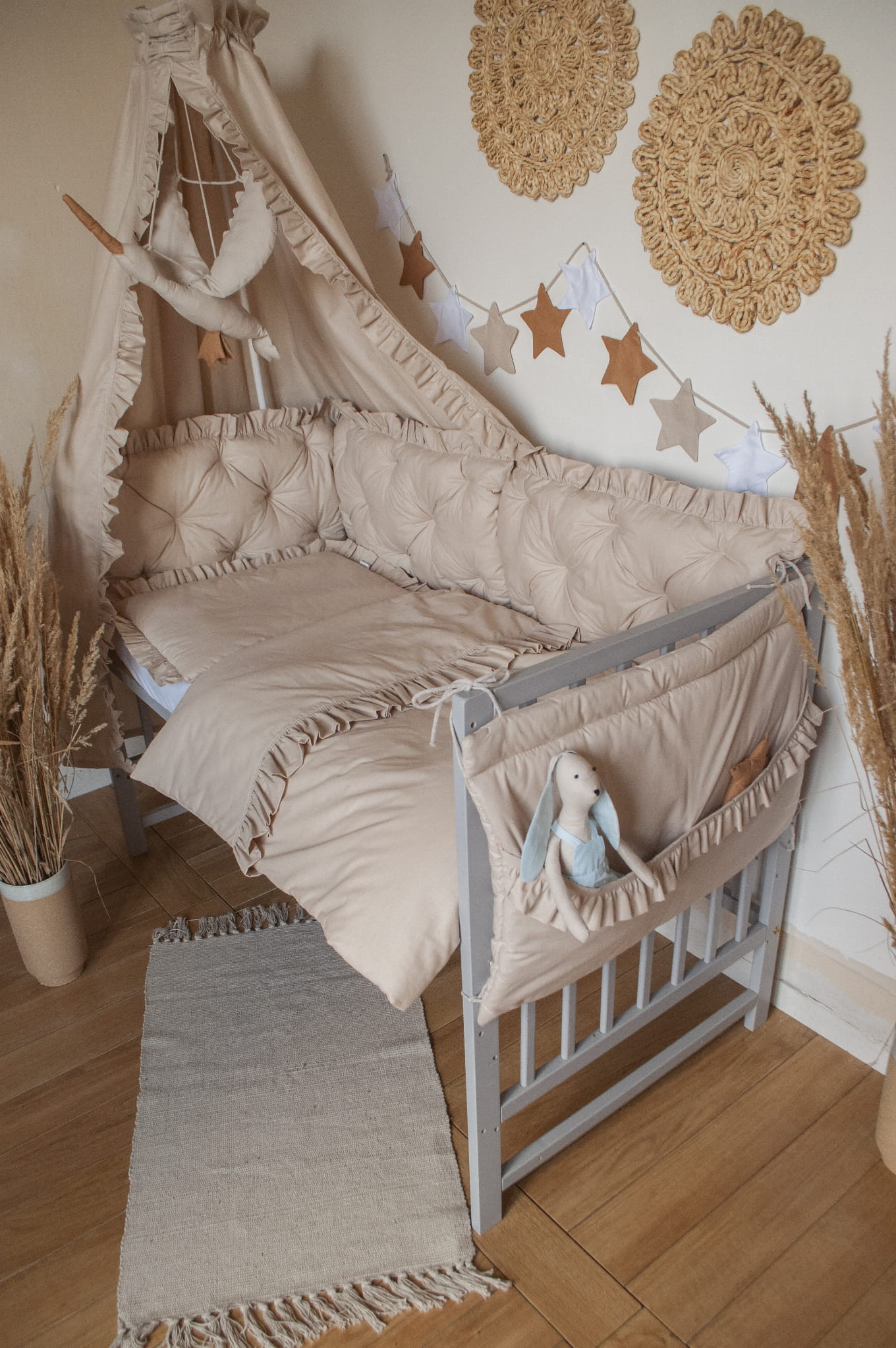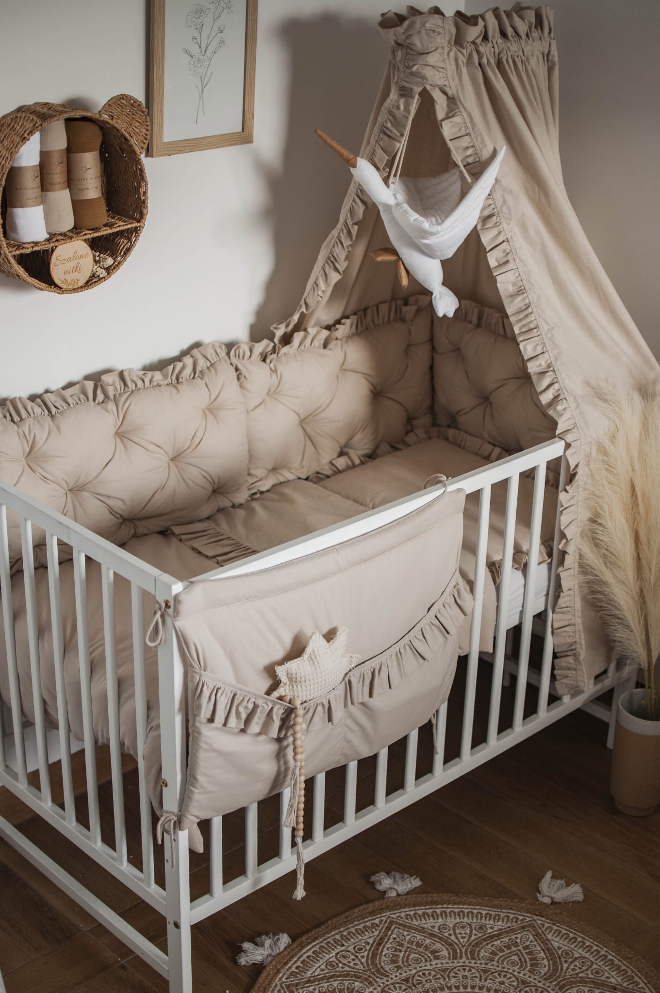 W zestawie znajduje się: BALDACHIM bez stelaża//KOŁDERKA Z PODUSZKĄ z wypełnieniem//OCHRANIACZ PIKOWANY na szczebelki, 3 panele 30x60//ORGANIZER z 2 kieszeniami