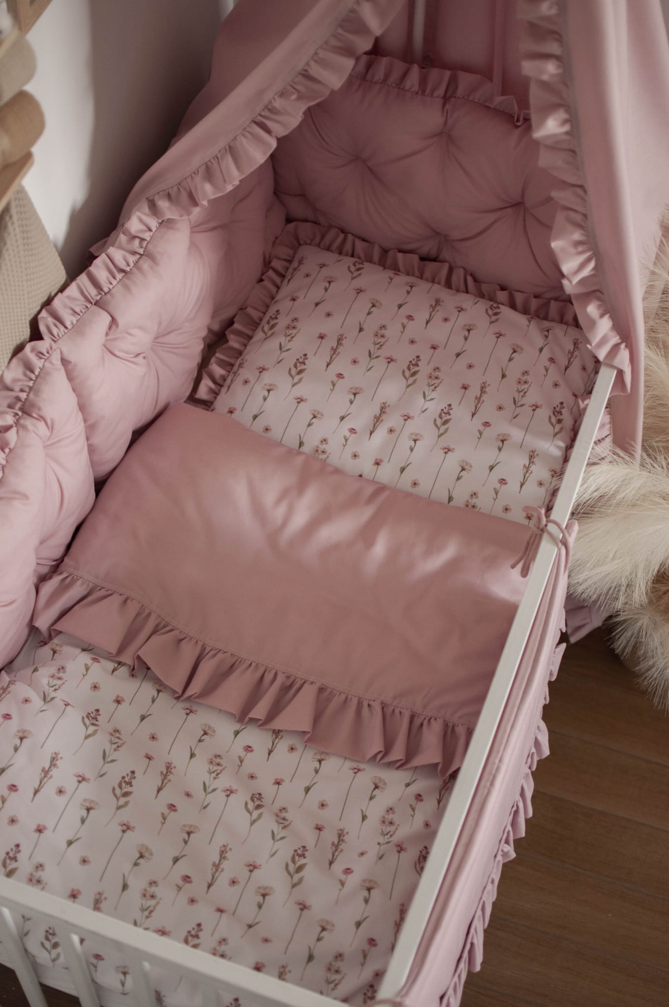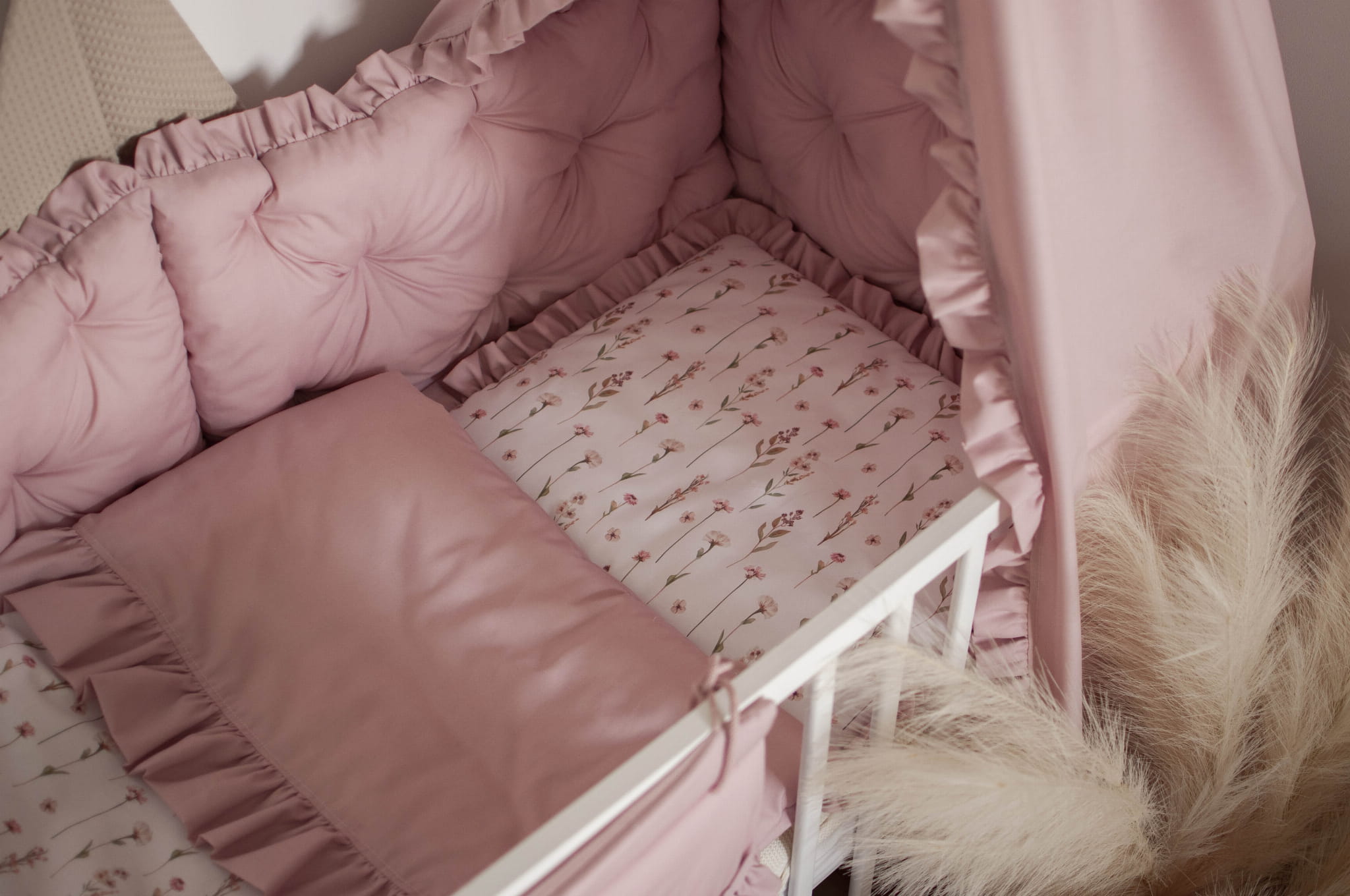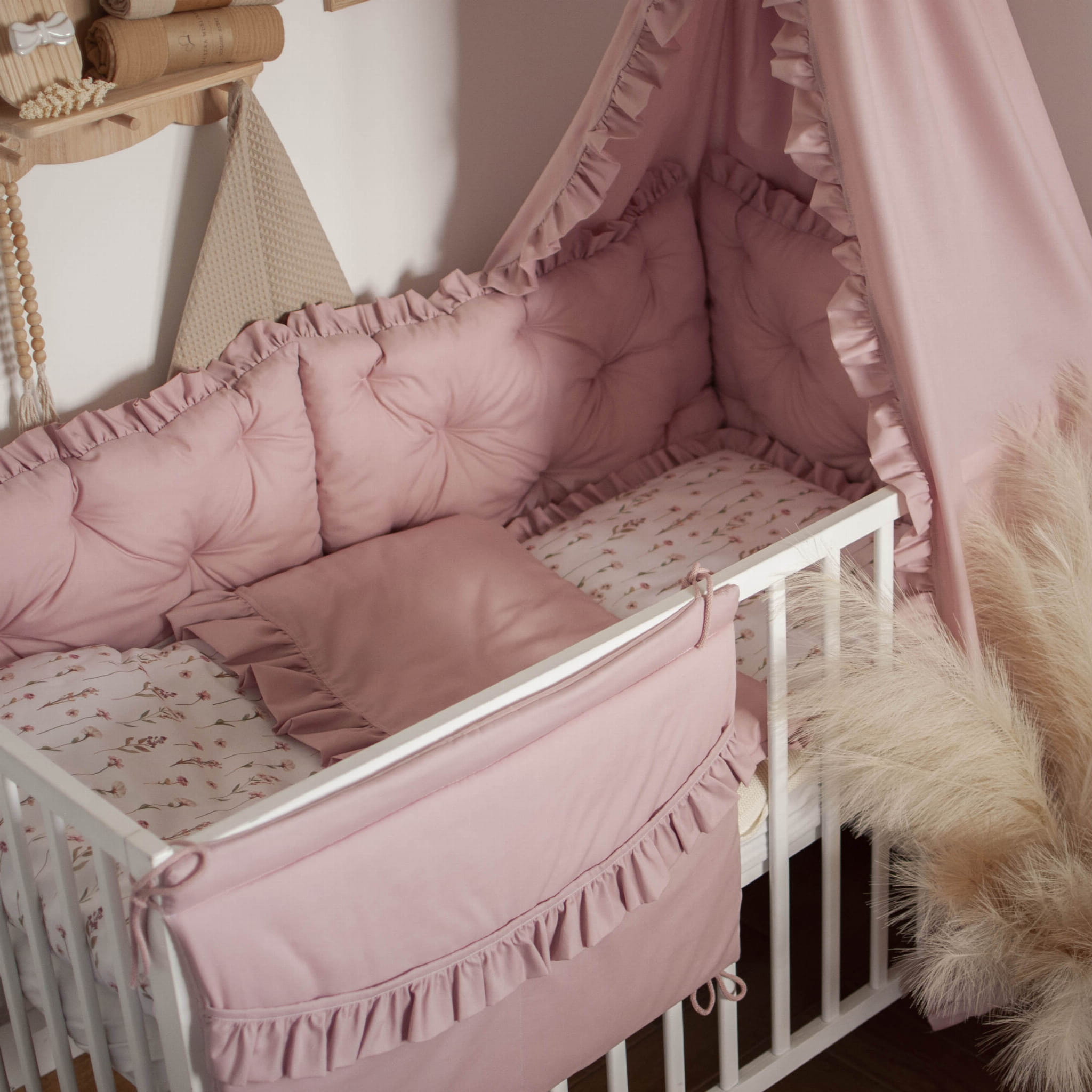ZESTAW wyposażenie do łóżeczka 7 elementów KWIATOWE ECHO + BRUDNY RÓŻ