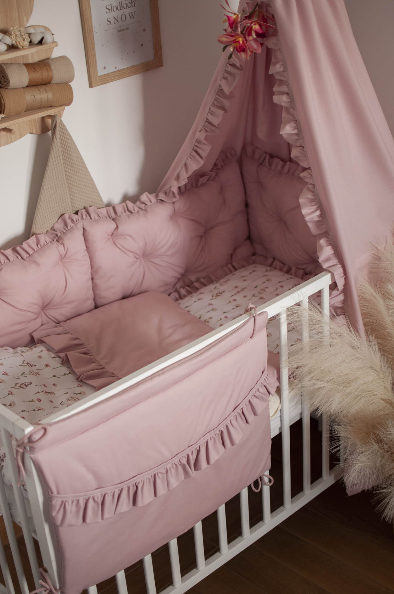 W zestawie znajduje się: BALDACHIM bez stelaża//KOŁDERKA Z PODUSZKĄ z wypełnieniem//OCHRANIACZ PIKOWANY na szczebelki, 3 panele 30x60//ORGANIZER z 2 kieszeniami