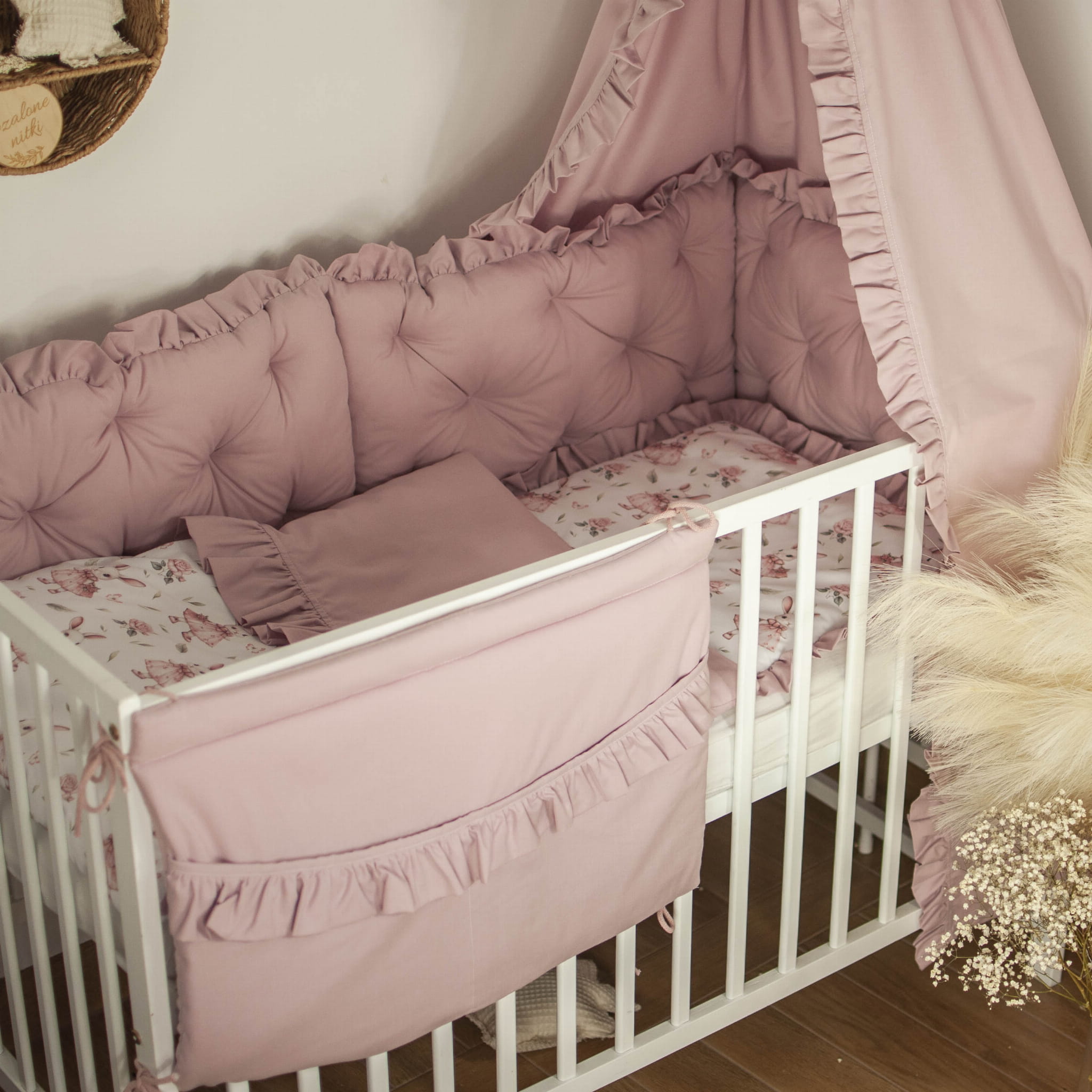 W zestawie znajduje się: BALDACHIM bez stelaża//KOŁDERKA Z PODUSZKĄ z wypełnieniem//OCHRANIACZ PIKOWANY na szczebelki, 3 panele 30x60//ORGANIZER z 2 kieszeniami
