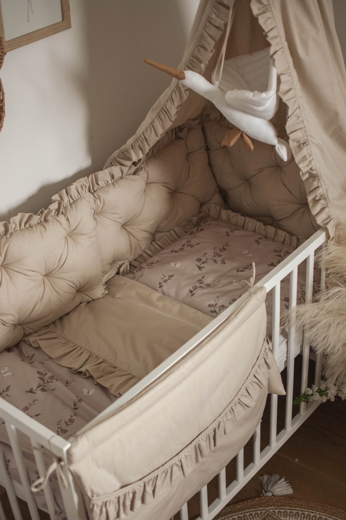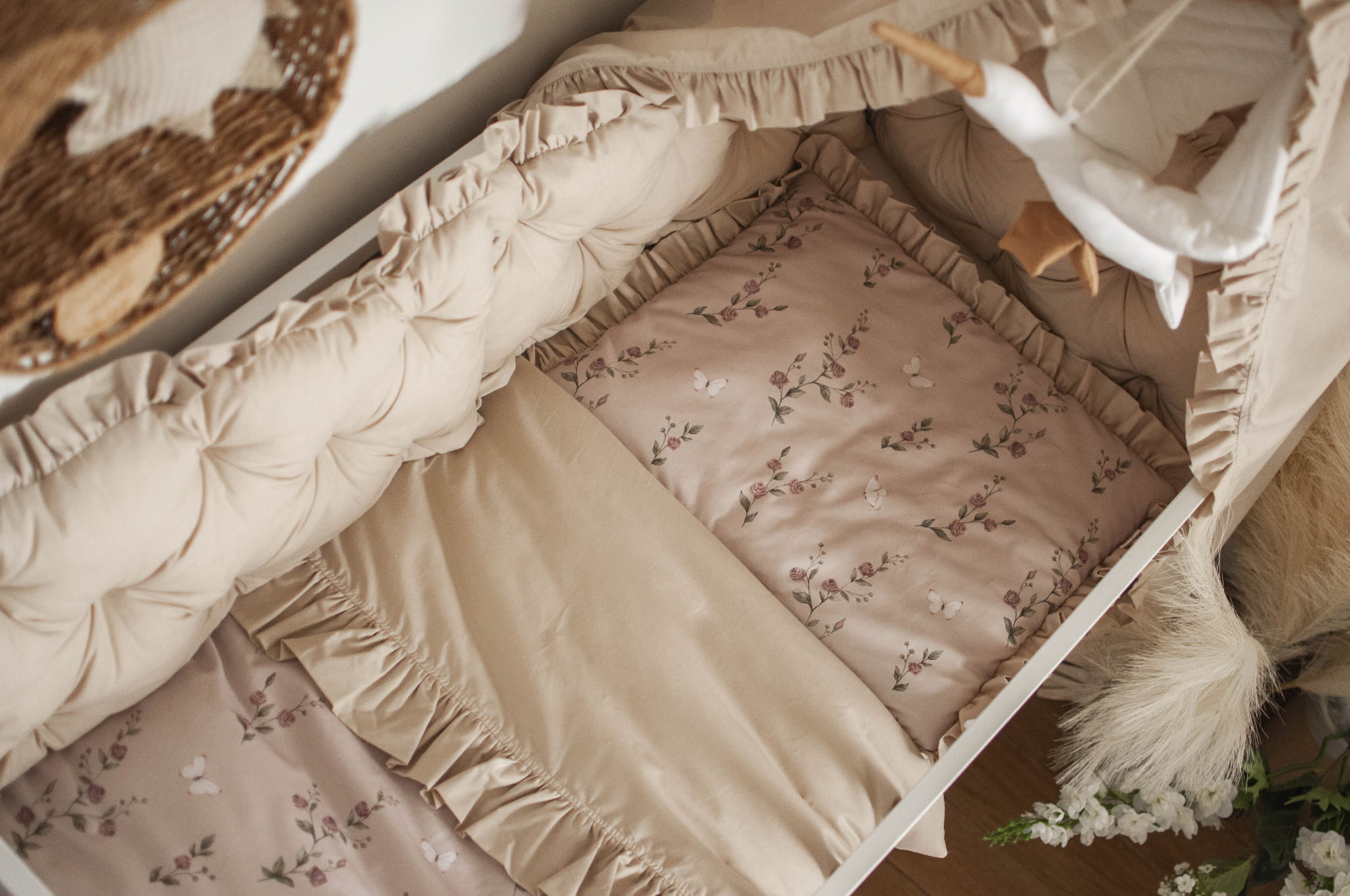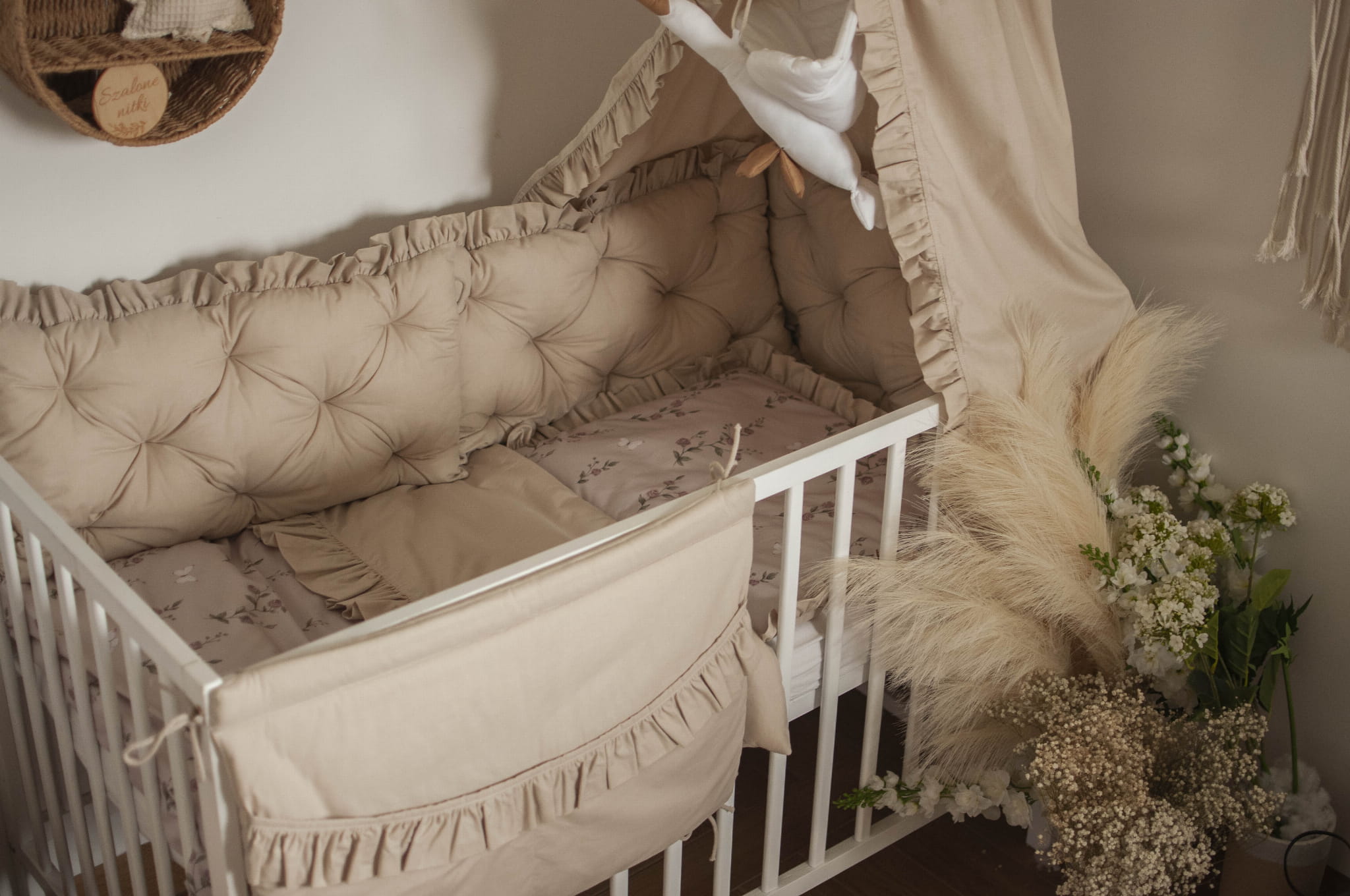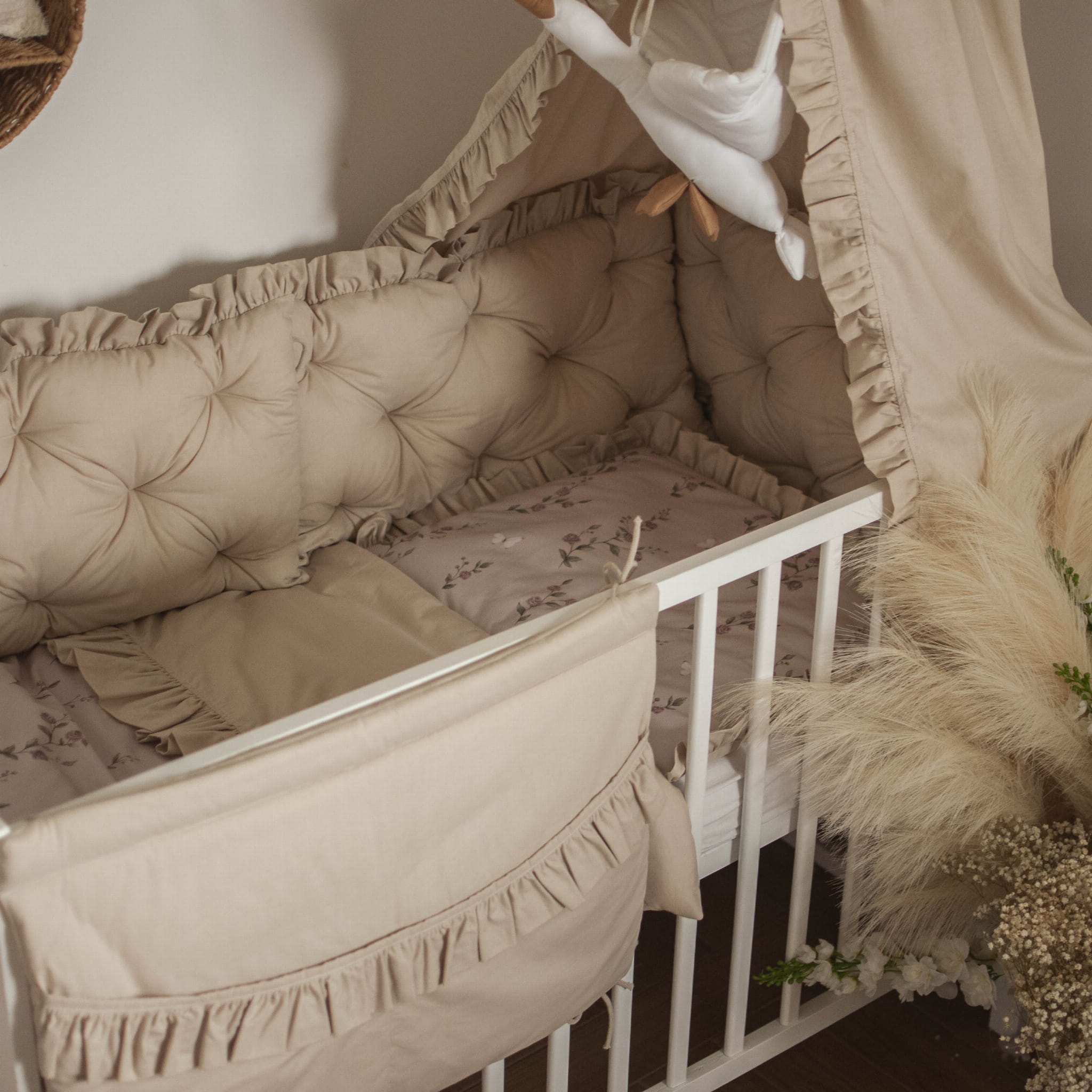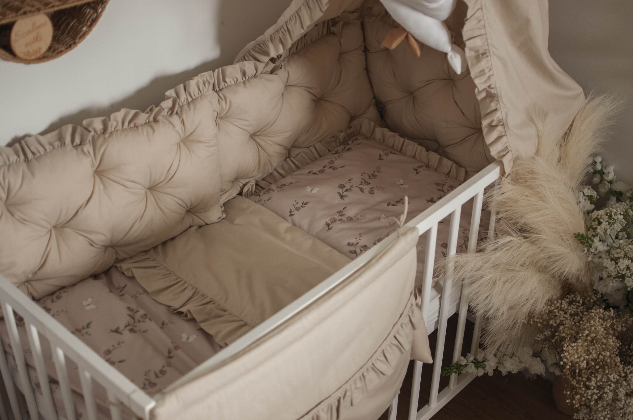 ZESTAW wyposażenie do łóżeczka 7 elementów ZACZAROWANY OGRÓD+BEŻ
