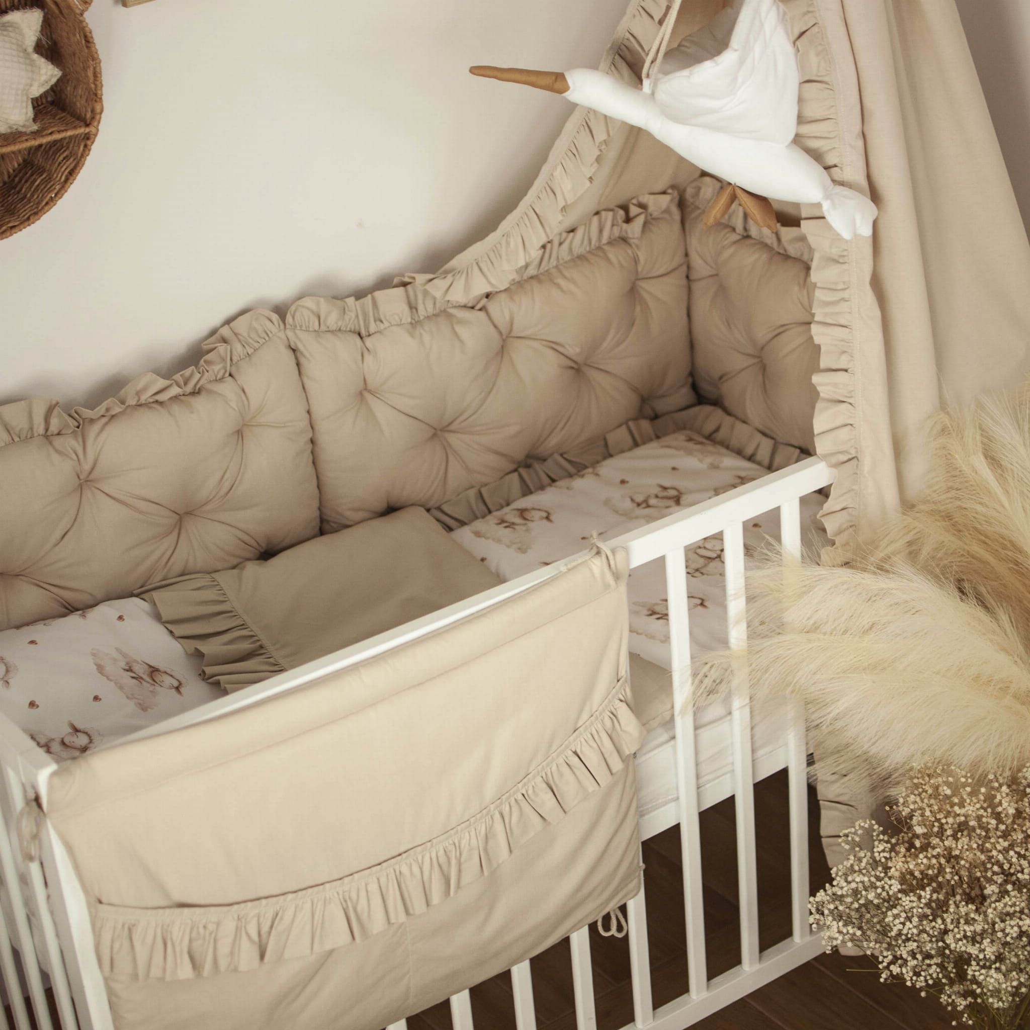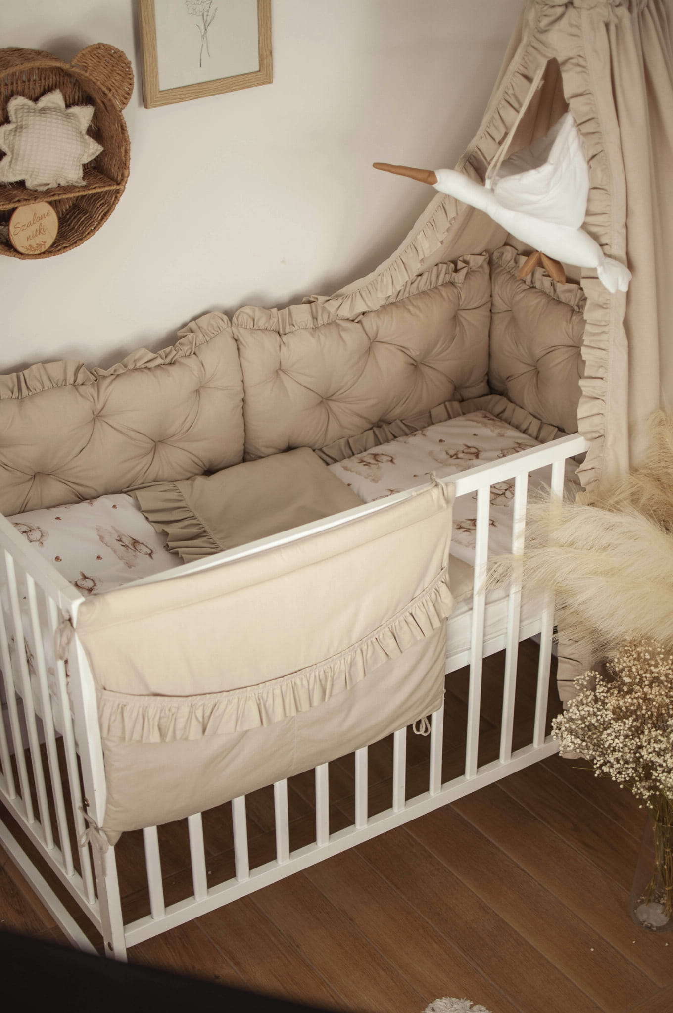 W zestawie znajduje się: BALDACHIM bez stelaża//KOŁDERKA Z PODUSZKĄ z wypełnieniem//OCHRANIACZ PIKOWANY na szczebelki, 3 panele 30x60//ORGANIZER z 2 kieszeniami